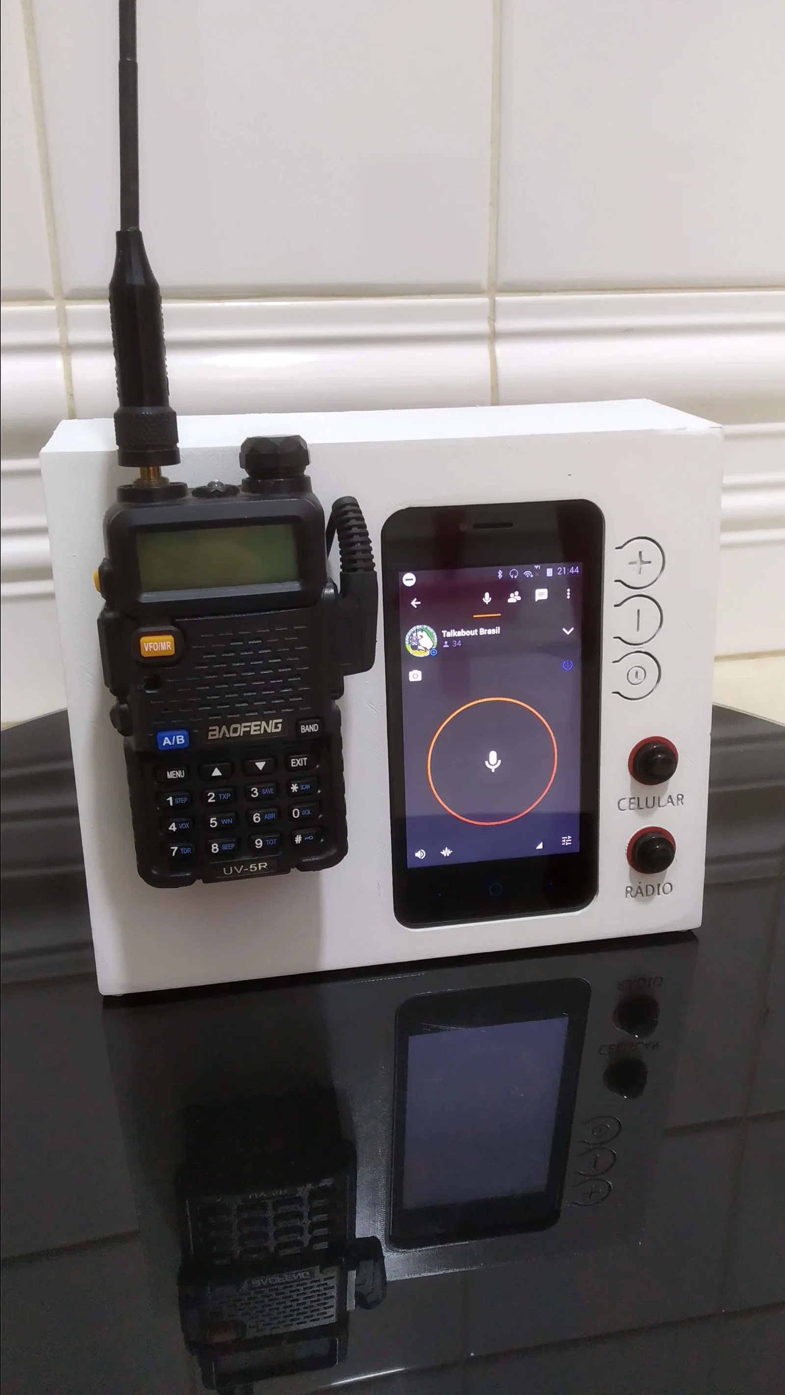 Điểm đặc biệt của thiết kế này là khả năng cố định chắc chắn chiếc Baofeng UV5R thông qua các điểm tiếp xúc pin trên máy. Khi đặt máy vào đế, bạn không chỉ có một góc làm việc ngăn nắp mà còn an tâm vì máy được giữ cố định, tránh rơi rớt trong quá trình sử dụng. Thiết kế thông minh này cho phép anh em kết nối nguồn điện ổn định thông qua chân pin, biến chiếc bộ đàm cầm tay trở thành một trạm thu phát cố định gọn gàng ngay trên bàn làm việc hoặc trong xe hơi.