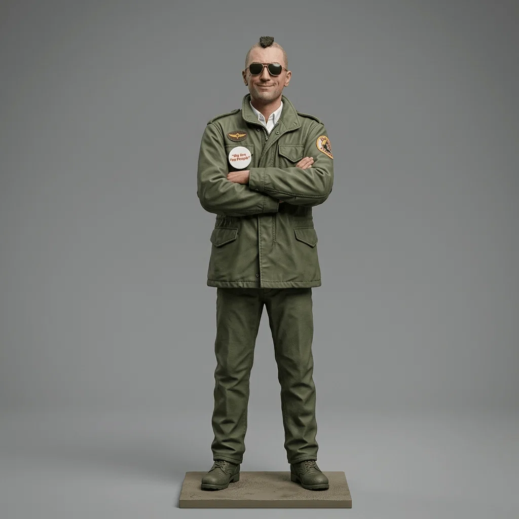 Nếu bạn là một người hâm mộ điện ảnh kinh điển, đặc biệt là bộ phim Taxi Driver năm 1976, thì đây chắc chắn là mô hình 3D mà bạn không thể bỏ qua. Nhân vật Travis Bickle, do nam tài tử Robert De Niro thủ vai, được tái hiện lại một cách đầy ấn tượng và chi tiết với phong cách đặc trưng nhất của ông. Từ kiểu tóc Mohawk, chiếc kính râm đen đến chiếc áo khoác quân đội M-65 mang tính biểu tượng, tất cả đều được khắc họa tỉ mỉ để tạo nên một tác phẩm nghệ thuật thu nhỏ đầy cảm xúc ngay trên bàn làm việc của bạn.