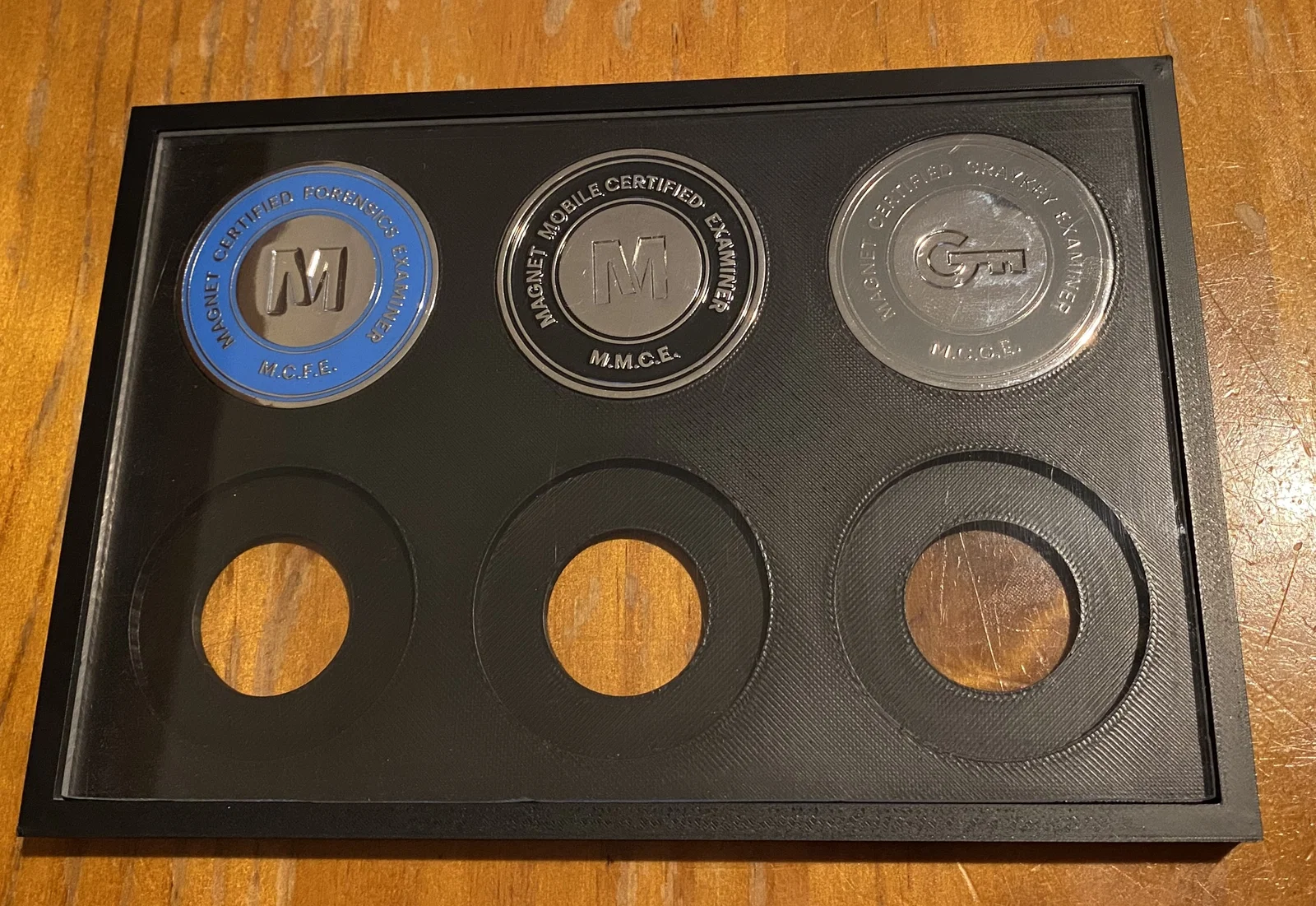 Cái giá đỡ này được thiết kế để giữ 6 đồng xu thử thách (challenge coins) có đường kính 44mm và độ dày 3mm.