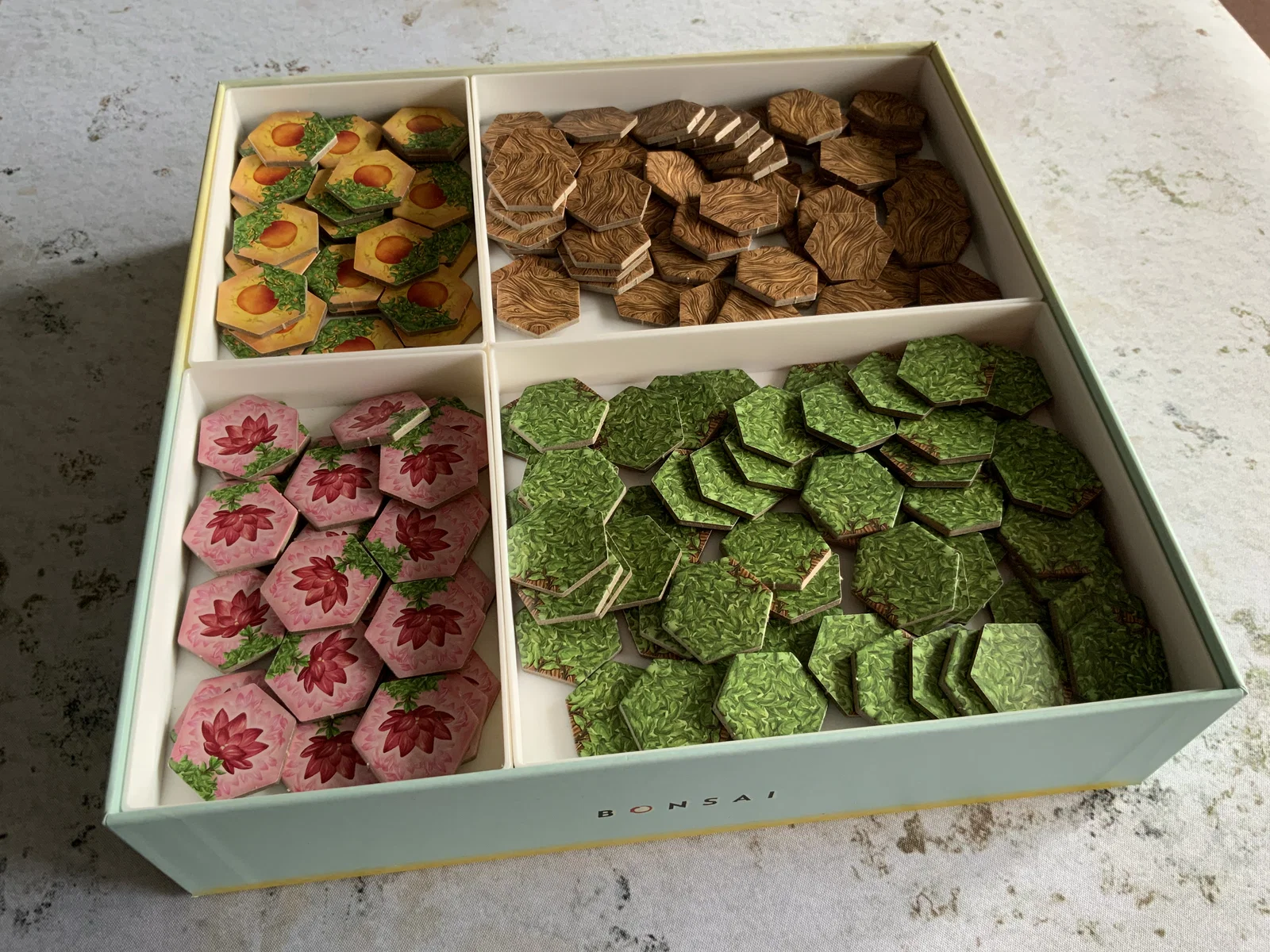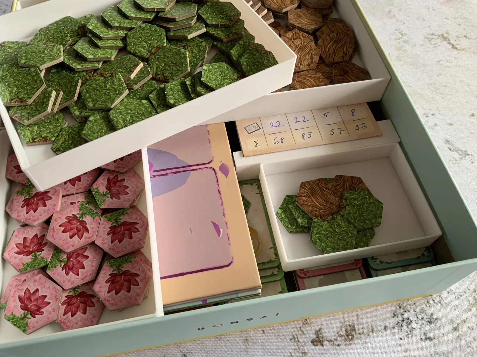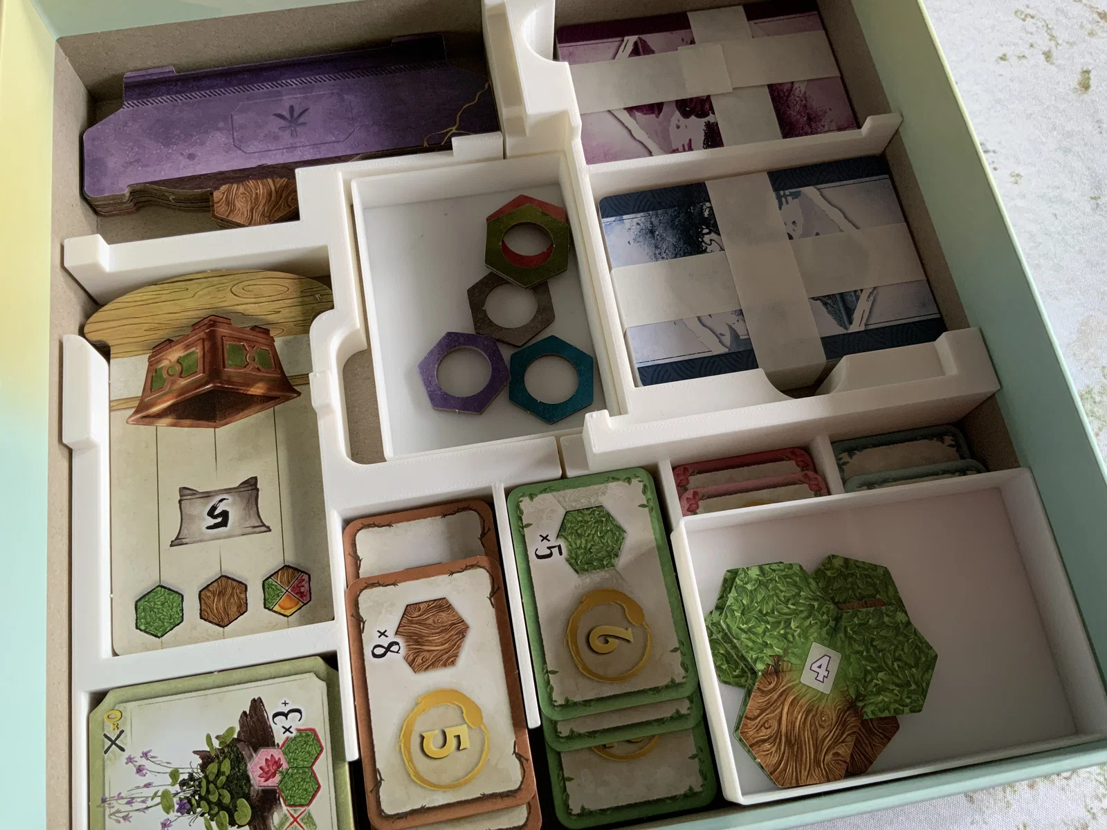Khay lớn dùng để đựng gỗ và lá, được thiết kế để khớp hoàn hảo với khay gốc. Ngoài ra, tôi còn bổ sung thêm các khay nhỏ để chứa bản mở rộng, giúp tận dụng tối đa khoảng trống trong hộp game một cách gọn gàng và tiện lợi.