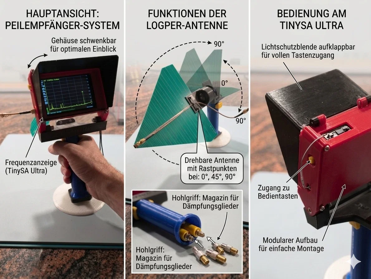 Thiết bị định vị sóng vô tuyến (Hand-Funk-Peil-Empfänger) nhỏ gọn và có thiết kế dạng module này biến chiếc TinySA Ultra của bạn thành một bộ thu định vị chuyên nghiệp, dùng để dò tìm các nguồn gây nhiễu, nguồn phát sóng hoặc phân tích tín hiệu RF. Sản phẩm cực kỳ phù hợp cho các cuộc thi "săn cáo" (Fuchsjagd) của các câu lạc bộ vô tuyến nghiệp dư.