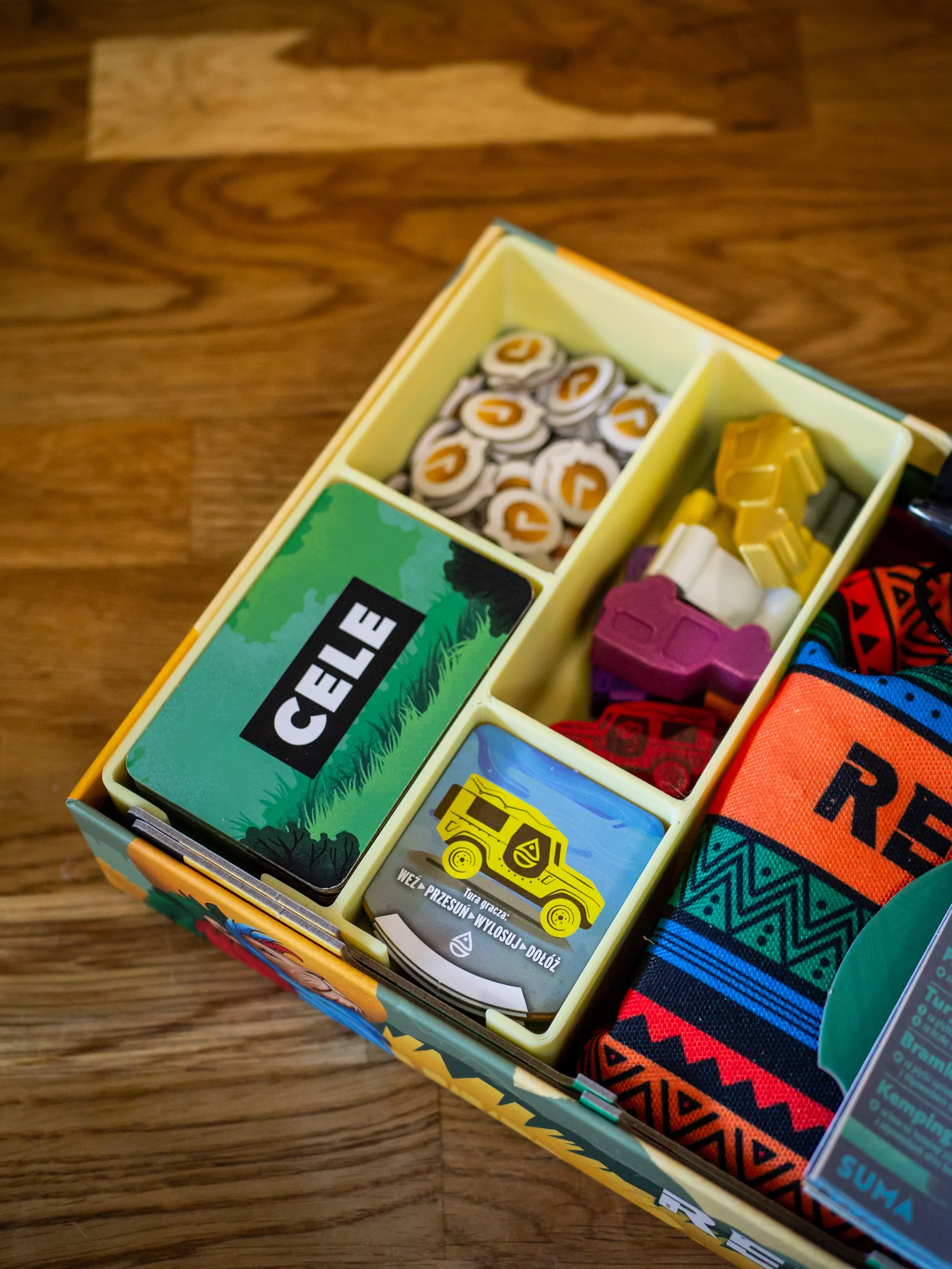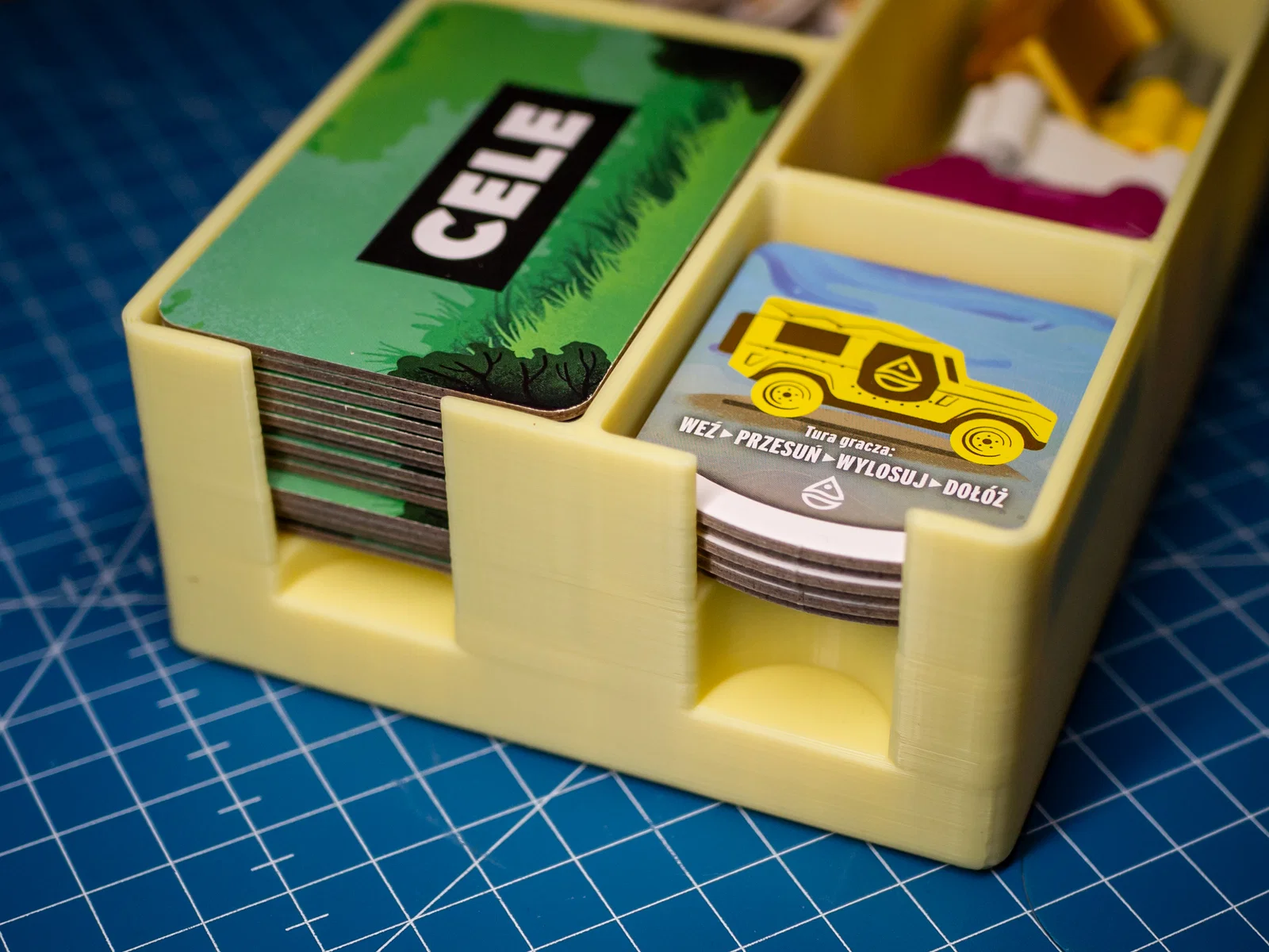 Khay này lưu trữ được tất cả vật phẩm (các tấm entrance tile, goal tile, xe Jeep, marker lượt đi và các marker hoàn thành).