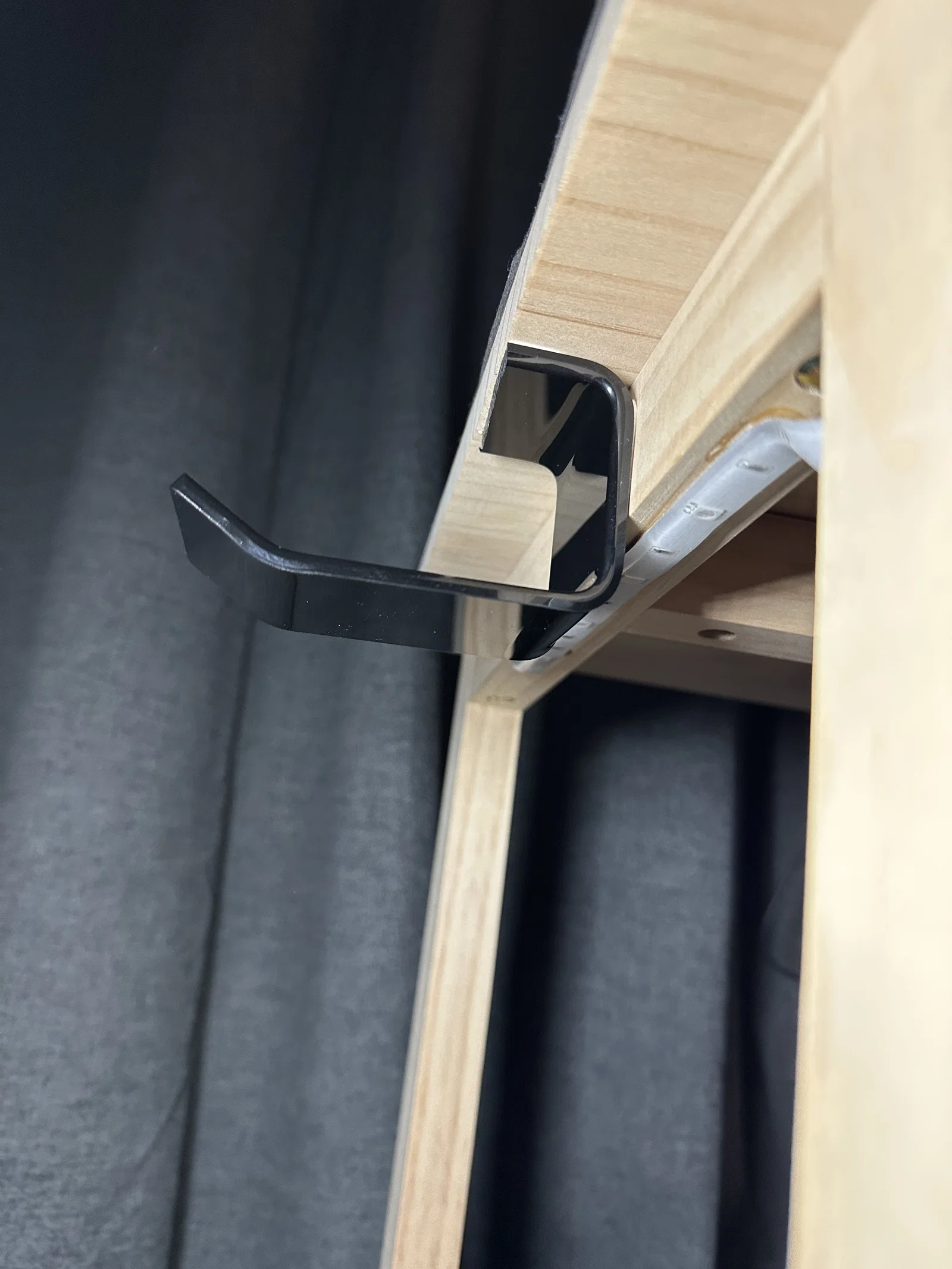 - Lắp đặt: Hãy chọn loại băng dính hai mặt chuyên dụng, có khả năng chịu lực tốt để đảm bảo móc treo luôn bám chắc vào bề mặt gỗ dưới gầm bàn.