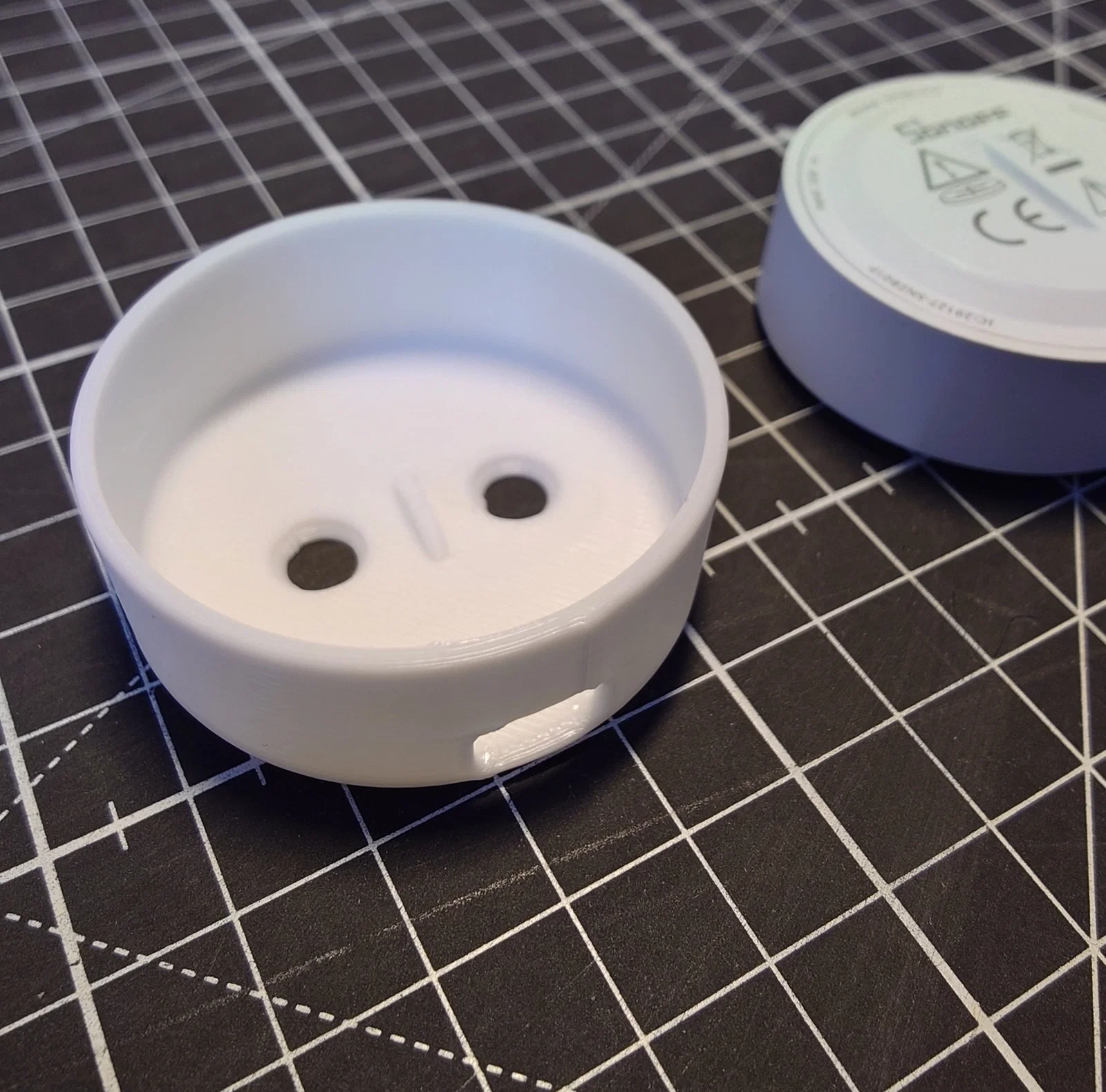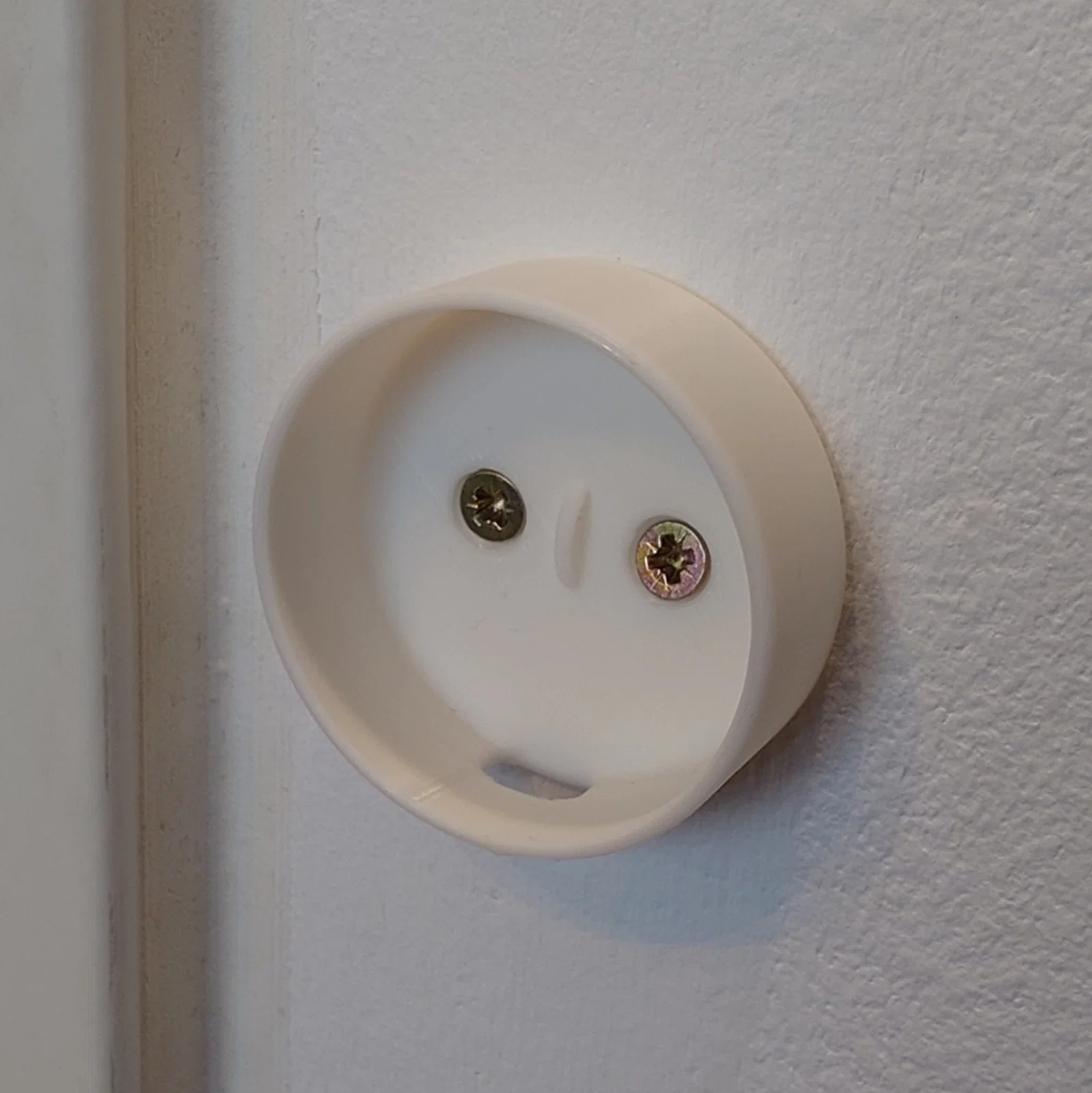 Giá đỡ gắn tường cho SONOFF SNZB-01P. Nam châm tích hợp sẵn trong nút bấm sẽ hít chặt vào hai ốc vít đầu bằng 3.5 mm, giúp nút bấm không bị rơi ra ngoài. Một cái lẫy nhỏ ở mặt dưới sẽ khớp vào rãnh trên nắp ngăn pin, giúp giữ cố định để nút không bị xoay.