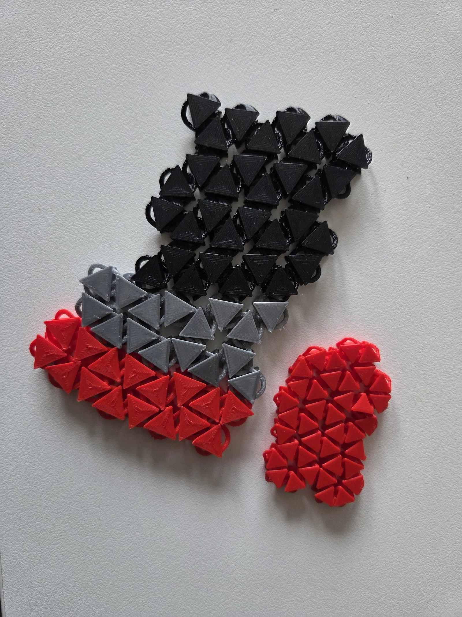 Hiện nay đã có một số loại vải in 3D có thể kết nối với nhau, cũng có khá ít loại vải dạng hình tam giác, nhưng mình vẫn chưa tìm thấy loại nào dạng tam giác mà lại có thể kết nối được, nên đây là phiên bản của mình dành cho loại thiết kế này.