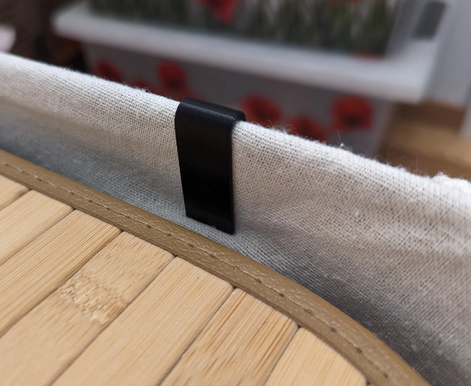 Một kẹp nhỏ để giữ túi giặt trong giỏ giặt bằng tre. Có thể điều chỉnh kích thước trong Fusion 360. Ví dụ, độ dày của thành giỏ và độ dày của các kẹp.