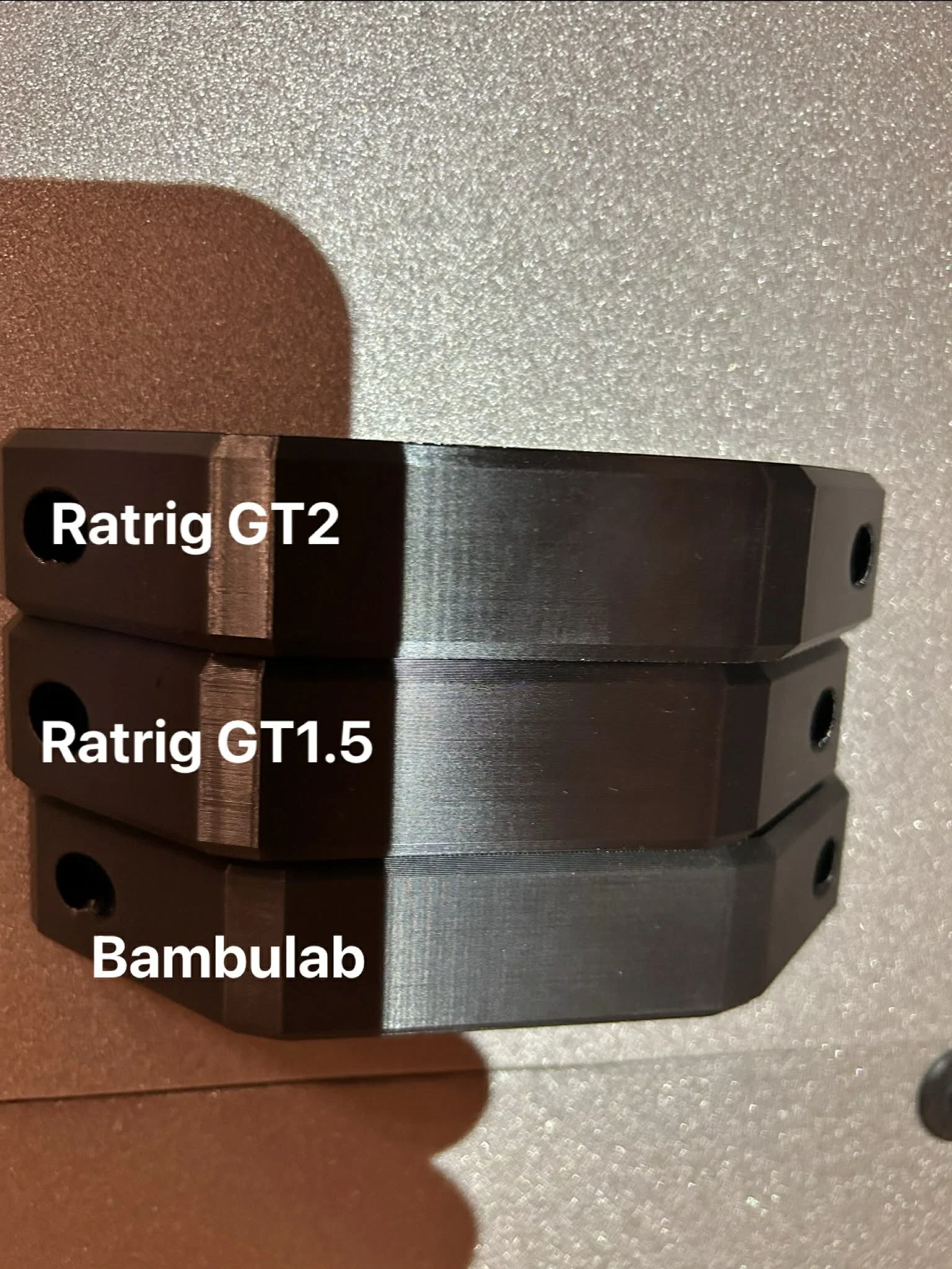 Ảnh so sánh cho thấy độ mịn bề mặt của cùng một mẫu in khi dùng dây đai GT2 tiêu chuẩn và dây đai GT1.5 mới trên chiếc RatRig V-Core 3.1 đã độ của mình, so sánh với máy Bambu Lab X1C.
