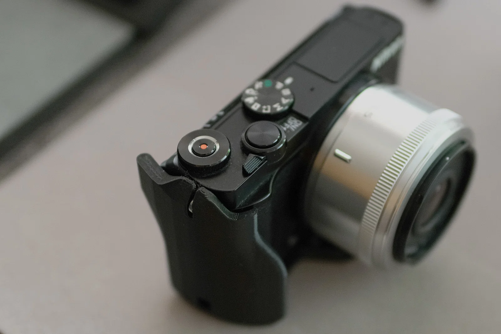 Thiết kế này sử dụng cơ chế ép chặt vào vị trí gắn dây đeo zin của máy để giảm độ rung lắc. Sau khi làm vậy và vát cạnh trên để ngón tay bạn dễ bấm nút chụp hơn, mình thấy không còn chỗ nào phù hợp để thêm chốt gắn dây đeo phía trên bên phải nữa.