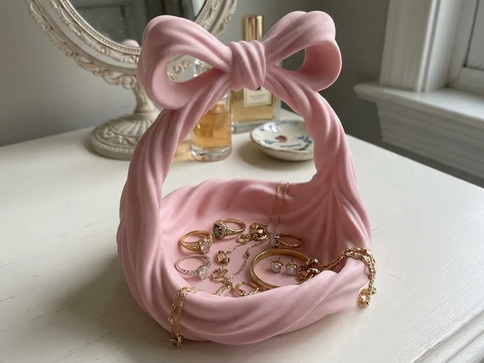 Bạn đang tìm kiếm một món phụ kiện trang trí bàn trang điểm vừa xinh xắn lại vừa tiện dụng để cất giữ những món trang sức nhỏ xinh như nhẫn, bông tai hay dây chuyền? Mẫu khay đựng trang sức được thiết kế với hình dáng một chiếc giỏ nhỏ có tay cầm thắt nơ điệu đà này chính là giải pháp hoàn hảo dành cho bạn. Với kiểu dáng mềm mại và tinh tế, sản phẩm này không chỉ giúp không gian của bạn trở nên ngăn nắp, gọn gàng mà còn đóng vai trò như một vật phẩm decor cực kỳ bắt mắt.