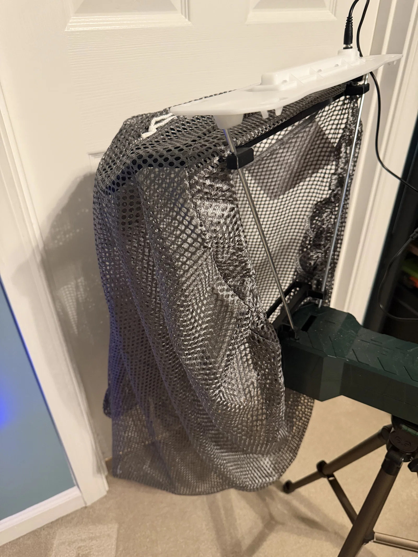 Việc đạn bay lung tung mỗi khi test bằng máy đo tốc độ (chronograph) làm mình thấy rất khó chịu, nên mình đã suy nghĩ cách giải quyết vấn đề này. Mình nảy ra ý tưởng dùng một chiếc túi rút đơn giản, giống như loại túi đựng đồ thể thao. Bạn chỉ cần bắn đạn xuyên qua máy đo tốc độ và đạn sẽ nằm gọn trong túi. Thiết kế này rất dễ lắp đặt và tháo dỡ, giúp thu gom đạn vô cùng tiện lợi. Mình thực hiện tất cả các bài test trên máy Caldwell Chronograph 2.0, nhưng thiết kế này có lẽ cũng hoạt động tốt với các mẫu máy khác.