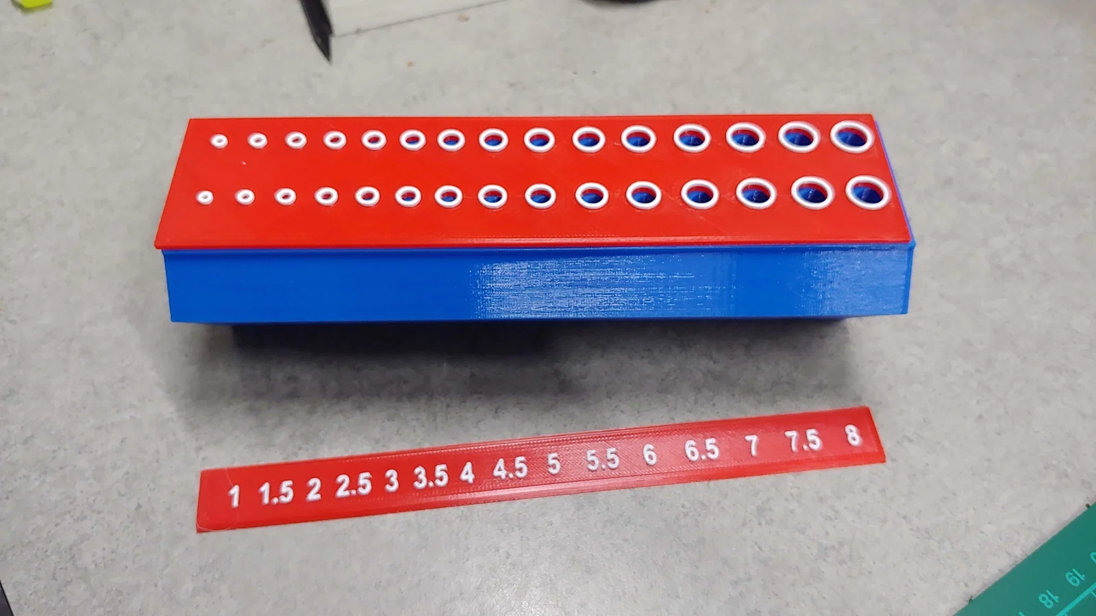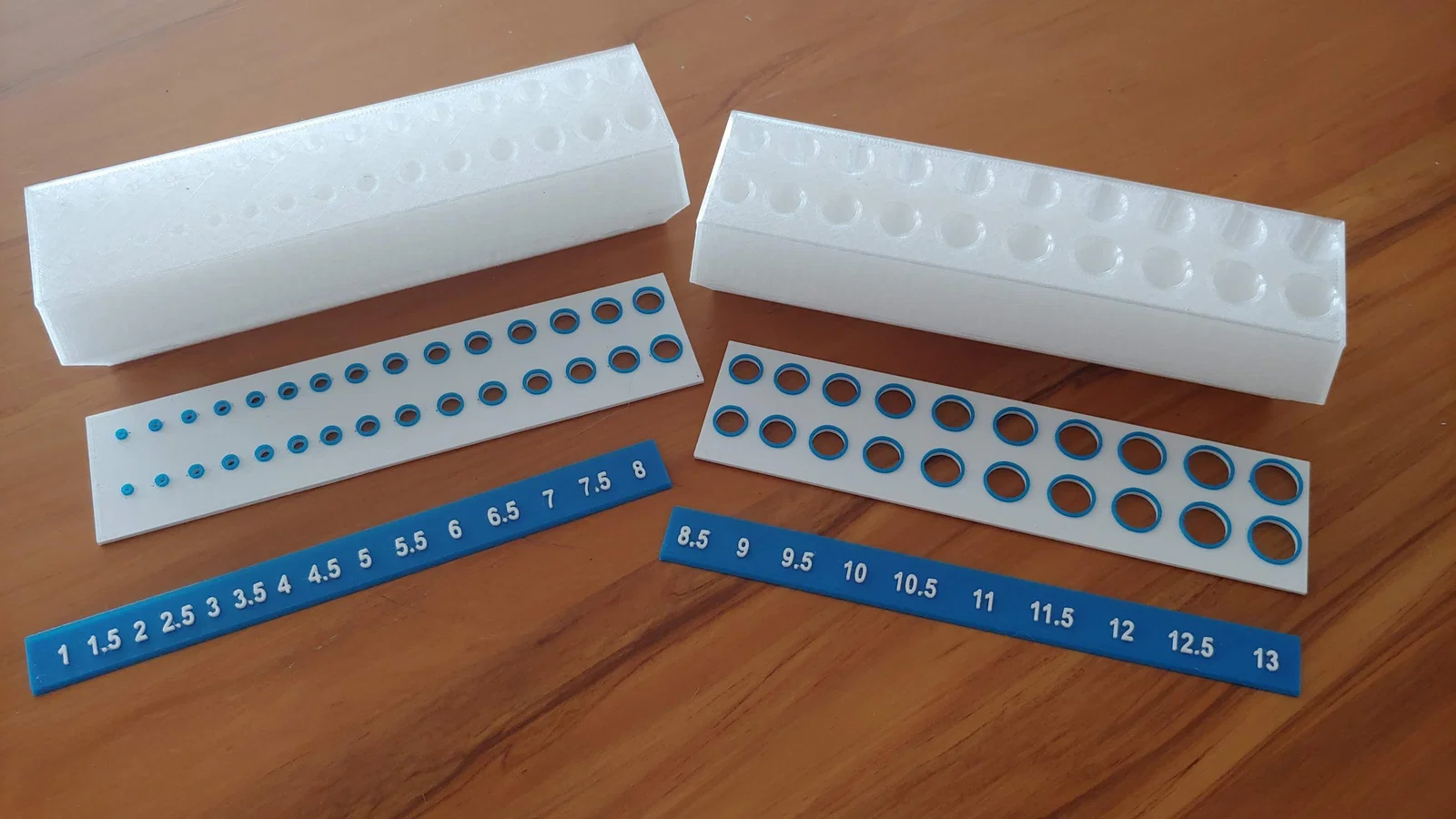 Hầu hết chúng ta đều có nhiều hơn một mũi khoan cùng kích cỡ nhưng chỉ có giá đỡ cho một chiếc. Thiết kế này giúp bạn cất giữ được hai mũi khoan cùng size. Bộ sản phẩm bao gồm khay cho các mũi từ 1 - 8 mm và một khay khác cho các mũi từ 8.5 - 13 mm, với bước nhảy 0.5 mm. Các tấm ốp mỏng ở mặt trước và mặt trên có thể được in bằng hai màu khác nhau, một kỹ thuật khá dễ thực hiện trên hầu hết các phần mềm Slicer. Việc sử dụng các tấm ốp này giúp giảm thiểu lãng phí nhựa nếu bạn lỡ cài đặt sai thông số thay nhựa trên máy in. Bạn nên dùng một ít keo silicone trong suốt để dán các tấm ốp vào giá đỡ (vừa sạch sẽ, dễ thao tác mà độ bám dính lại rất chắc). Giá đỡ này có thể đặt trực tiếp trên bàn làm việc hoặc bắt vít cố định lên tường. Bạn có thể in bằng bất kỳ loại nhựa nào, chỉ cần để mật độ infill thấp. Không cần sử dụng support. Lưu ý: Đây là giá đỡ cho mũi khoan hệ mét, tuy nhiên bạn cứ thoải mái thiết kế thêm các tấm ốp cho mũi khoan hệ inch và chia sẻ liên kết tại đây nhé.