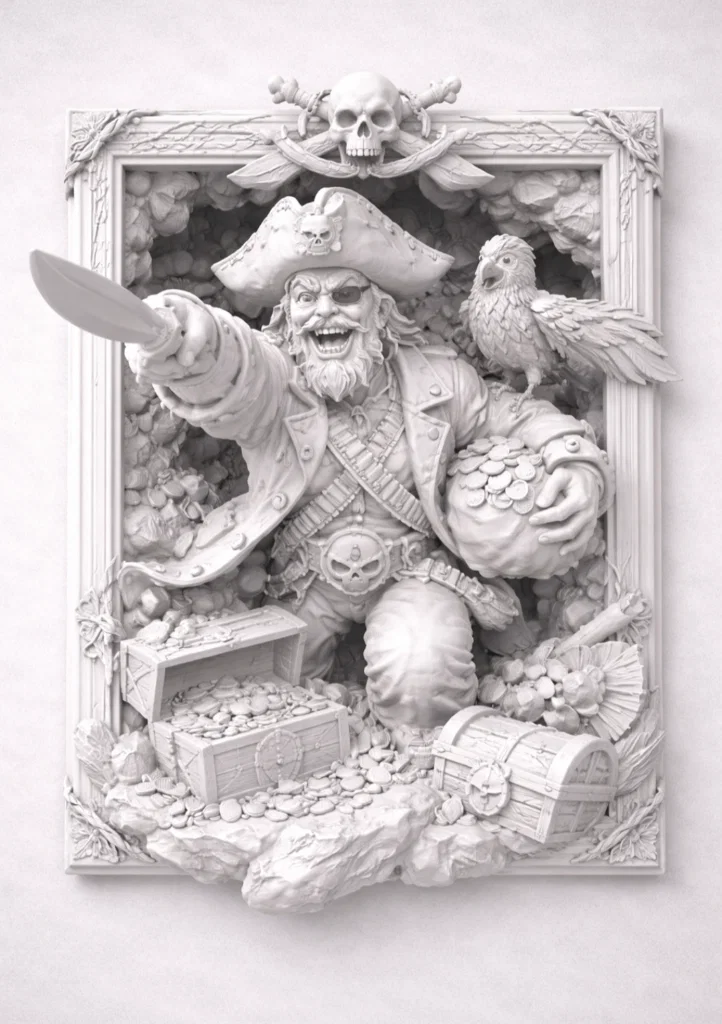 Nếu bạn là người đam mê văn hóa cướp biển hoặc đang tìm kiếm một tác phẩm trang trí nội thất có chiều sâu, mẫu "Pirate 3d Picture" này chính là lựa chọn không thể bỏ qua. Đây là một mẫu tranh phù điêu dạng 3D với độ chi tiết cực cao, khắc họa sống động hình ảnh một tên cướp biển hung dữ, tay cầm kiếm hướng về phía trước, bên cạnh là chú vẹt trung thành và kho báu vàng bạc ngổn ngang. Tác phẩm không chỉ đơn thuần là một món đồ trang trí, mà nó còn thổi hồn vào không gian sống của bạn, mang hơi hướng phiêu lưu và đầy cá tính.