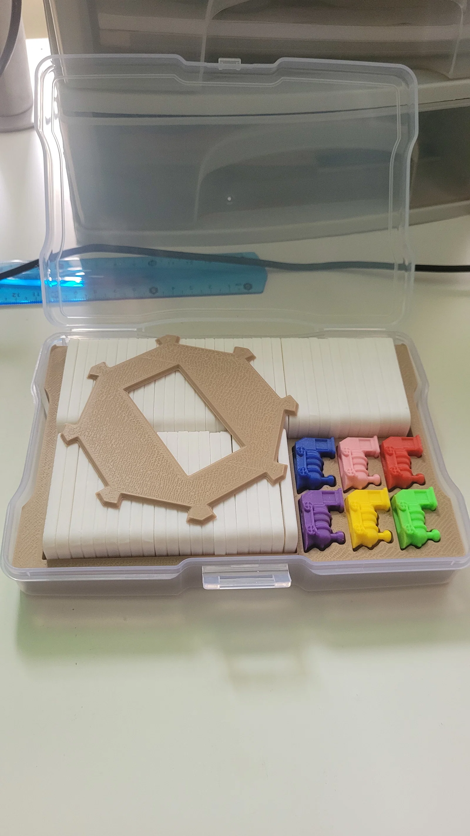 Tôi đã thấy một bản thiết kế hộp đựng (caddy) của người khác nhưng việc phải tự tay chỉnh kích thước và sắp xếp lại tất cả các mảnh ghép từ nhiều nguồn khác nhau thật sự rất vất vả. Vì vậy, tôi đã chủ động resize lại toàn bộ, thêm cả phần ga tàu (train station) để tất cả vừa khít vào những chiếc hộp đựng ảnh vốn rất phổ biến với cộng đồng chơi Board Game.
