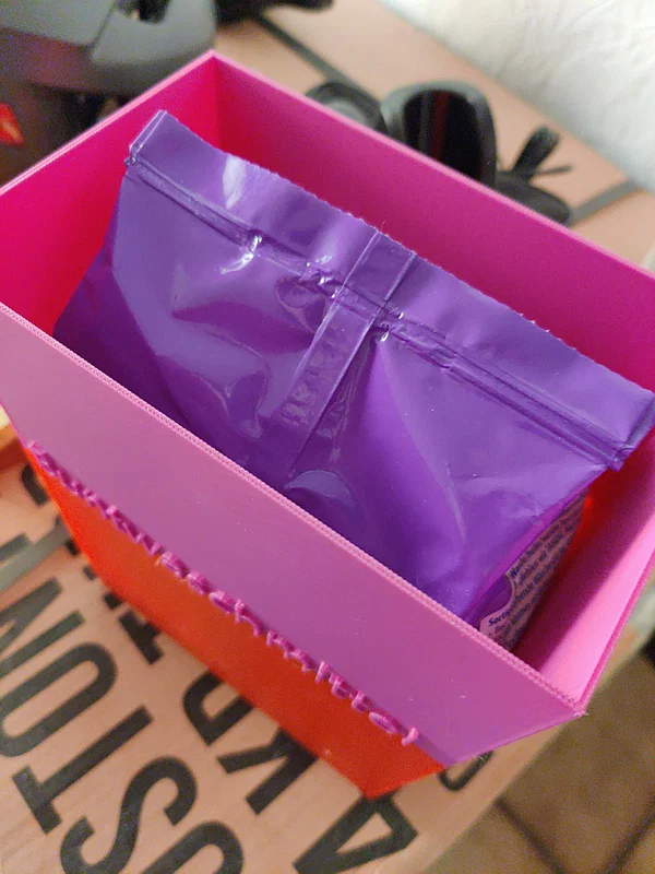 Hộp đựng bột giặt đơn giản cho túi 2kg, loại mà bạn thường thấy ở các siêu thị bình dân (như Aldi, Lidl, v.v.). Những mẫu hộp tôi tìm thấy ở đây hoặc trên Thingiverse đều không làm tôi ưng ý. Hoặc là thiết kế quá phức tạp không cần thiết, hoặc là tốn quá NHIỀU nhựa, dẫn đến thời gian in kéo dài khủng khiếp.