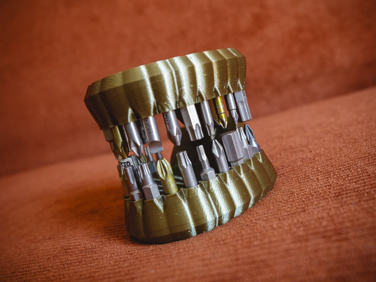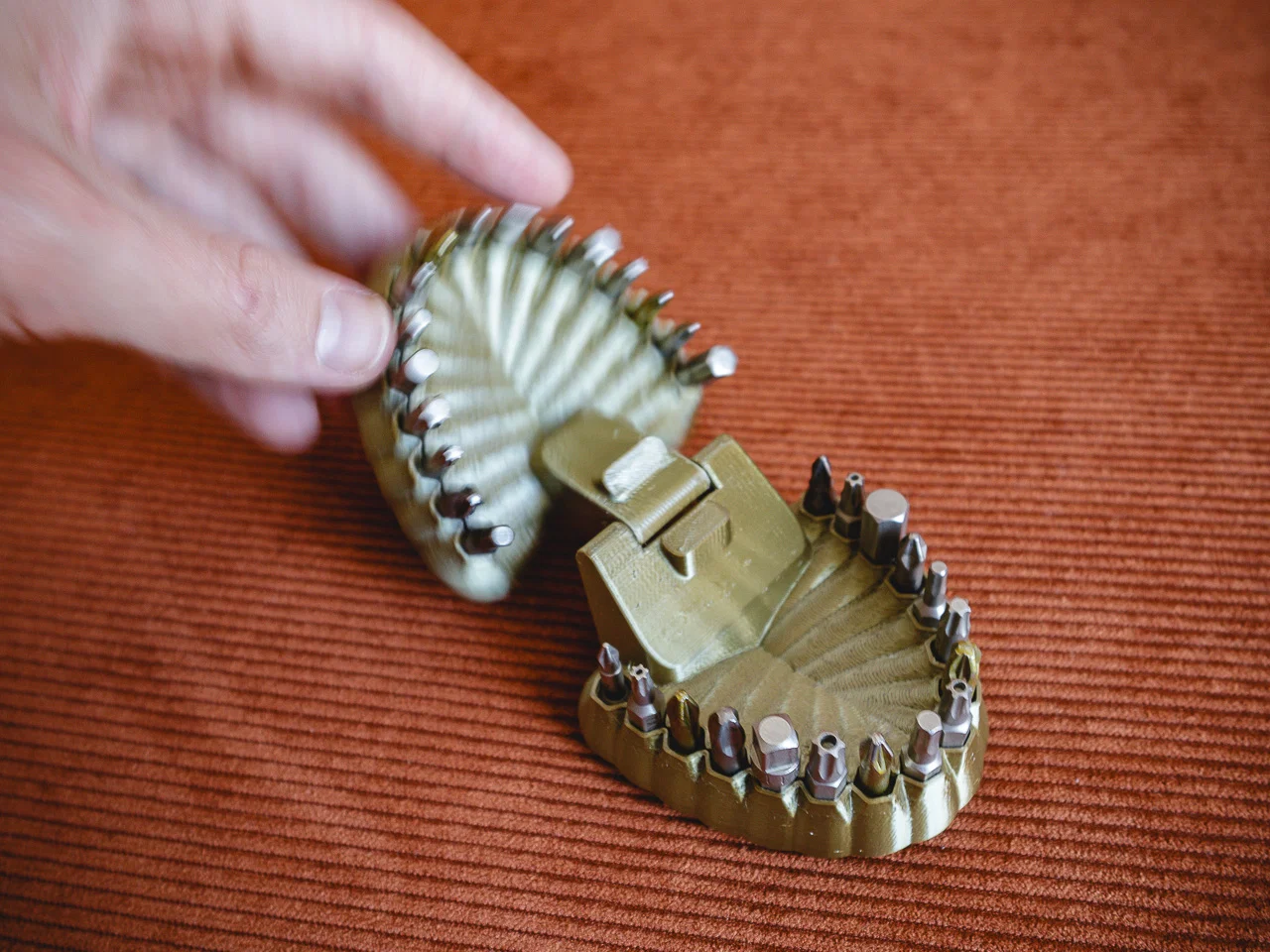 Hộp đựng mũi vít hex thiết kế độc đáo hình chiếc hàm với bản lề in liền khối (print-in-place). Sản phẩm cần dùng 32 viên nam châm 5x2mm để giữ mũi vít chắc chắn trong từng khe cắm. Mẫu in thú vị và tiện lợi cho góc làm việc.