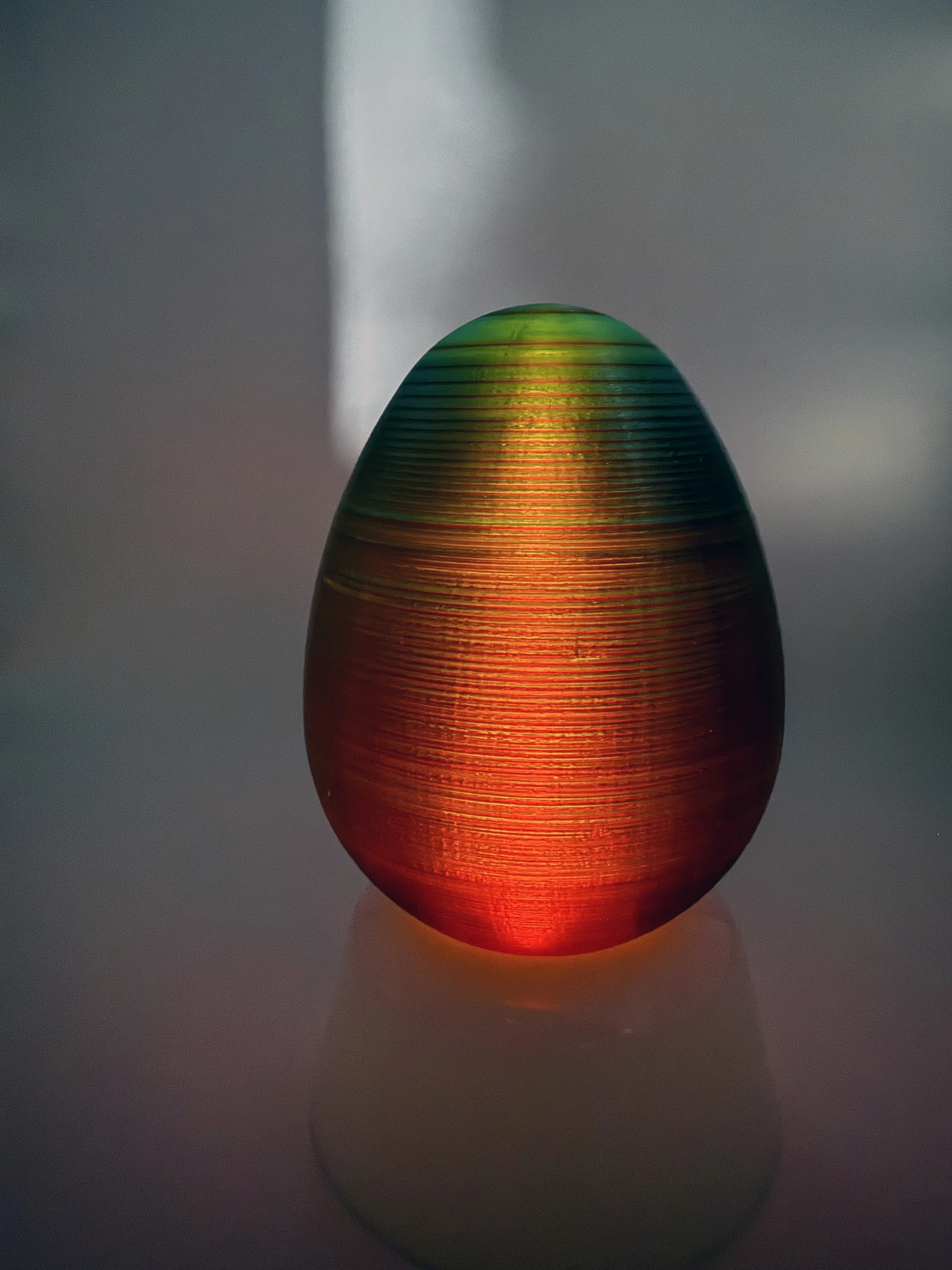 Một quả trứng MMU với lớp vỏ mỏng dùng để khuếch tán ánh sáng. Đặt nó lên trên nến tea light và dải màu gradient của bạn sẽ bừng sáng đầy nghệ thuật. Tương thích với nhiều dòng máy in đa vật liệu như Bambu AMS hoặc Prusa MMU.