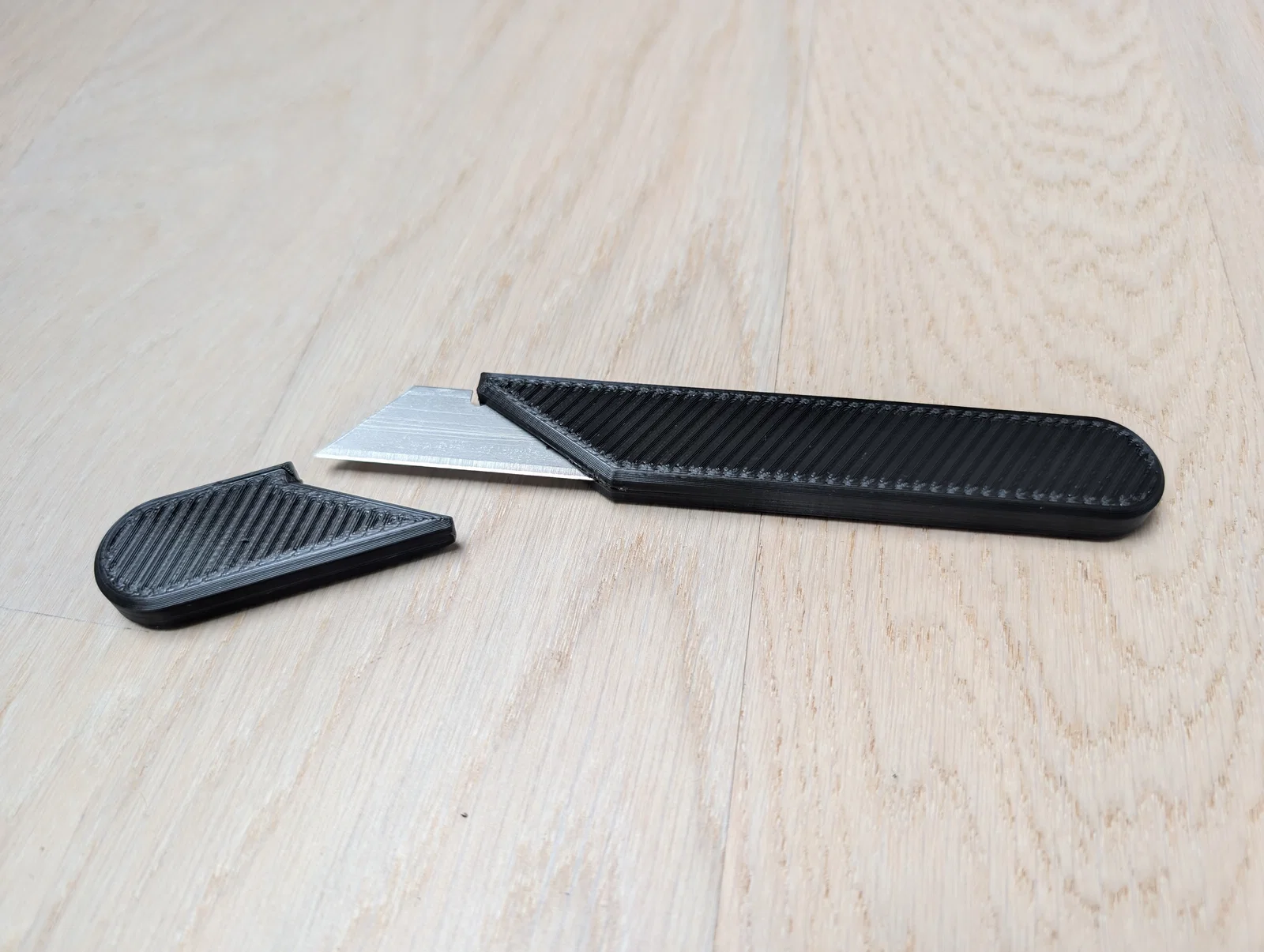 Đây là mẫu dao rọc giấy đơn giản có nắp đậy, cần tạm dừng máy in giữa chừng để gắn lưỡi dao vào.