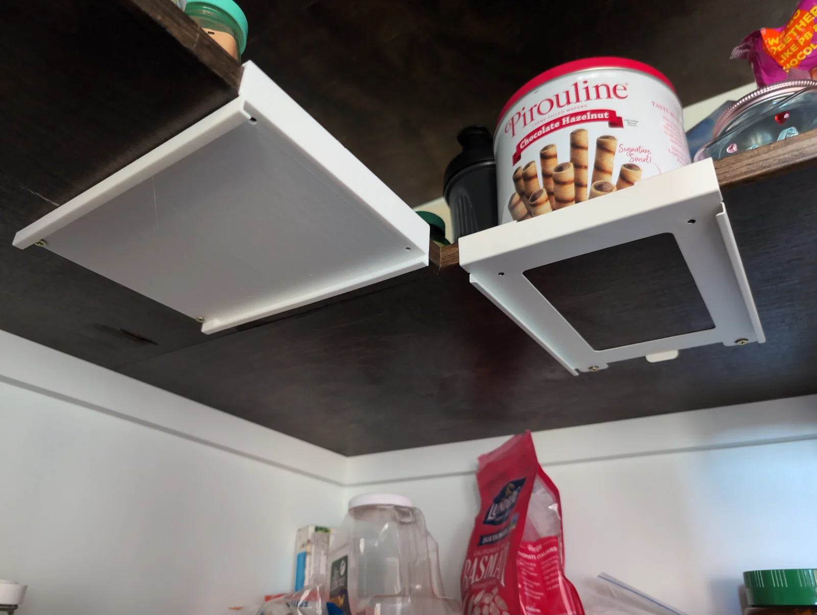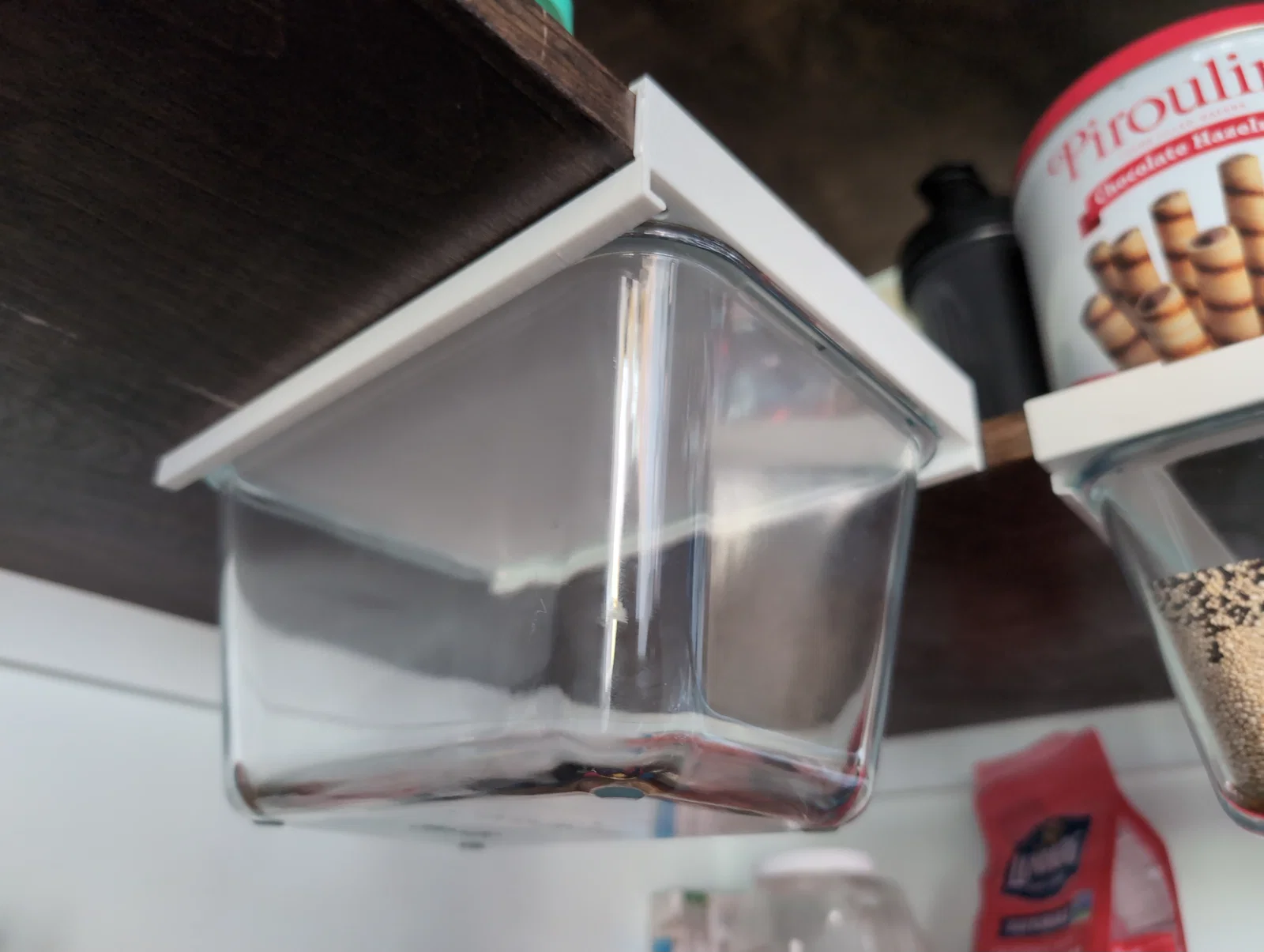 Việc lắp đặt cũng rất đơn giản, chỉ cần bắt vít trực tiếp vào mặt dưới của kệ tủ. Mọi chi tiết đã được đo đạc để khớp hoàn hảo với kiểu dáng của hộp IKEA 365+, đảm bảo độ ổn định khi chứa thực phẩm bên trong. Bạn có thể in nhiều giá treo để lắp thành một dãy, tạo ra hệ thống lưu trữ treo tường vô cùng tiện lợi.