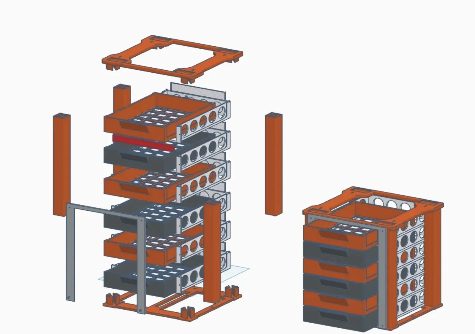 Đảm bảo tất cả các bộ phận in ra khớp với nhau trước khi lắp ráp hoàn thiện. Trượt các ngăn kéo vào khung, sau đó lắp đáy khung, các trụ và phần trên để hoàn thành giá đỡ. Phần vỏ ngoài giúp giữ khung ngăn kéo cố định và ổn định toàn bộ cấu trúc. Kiểm tra độ mượt của ngăn kéo và độ ổn định tổng thể trước khi đặt CFS lên trên.