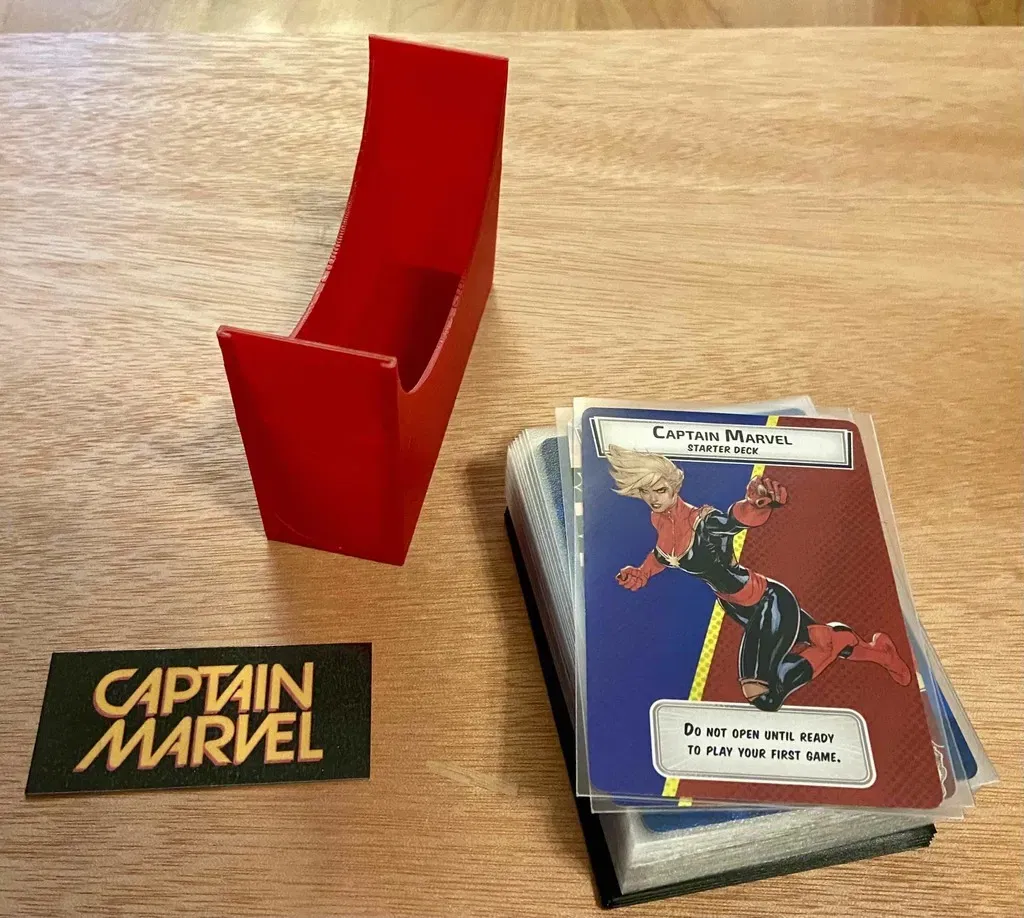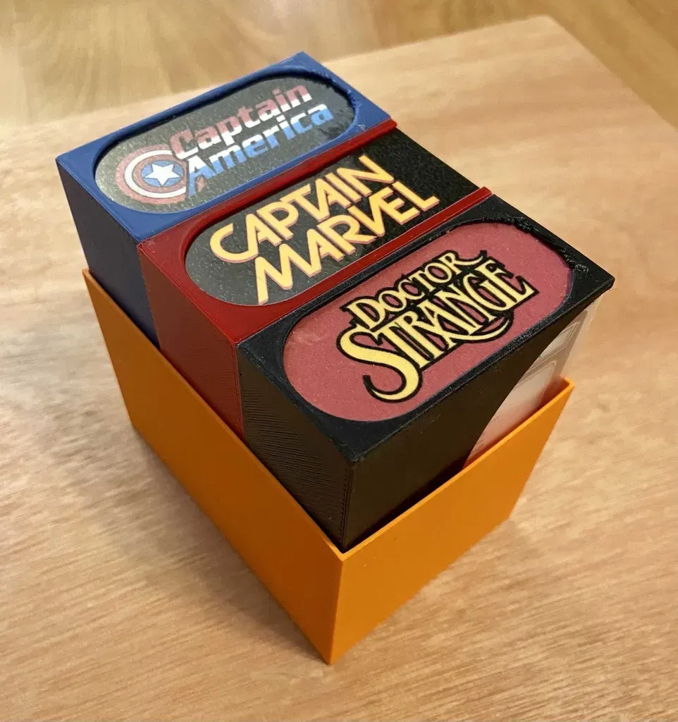 Tôi đã thiết kế hộp anh hùng Marvel Champions này để phù hợp với một bộ bài anh hùng bình thường, đã được bọc (đặc biệt là trong Dragon Shield), và được dán nhãn thông qua một tấm chèn in (giấy bìa/laminated được ưu tiên) được trượt vào một khe. Nếu các bao bì của bạn cao hơn Dragon Shields thì chúng có thể không vừa. Đây là một kích thước vừa vặn cho Dragon Shields nhưng tôi đã phải đảm bảo chiều cao theo chiều dọc vẫn cho phép hộp (Hobby Lobby Art Supply Box) đóng lại với các sách hướng dẫn trò chơi của tôi ở trên cùng.
