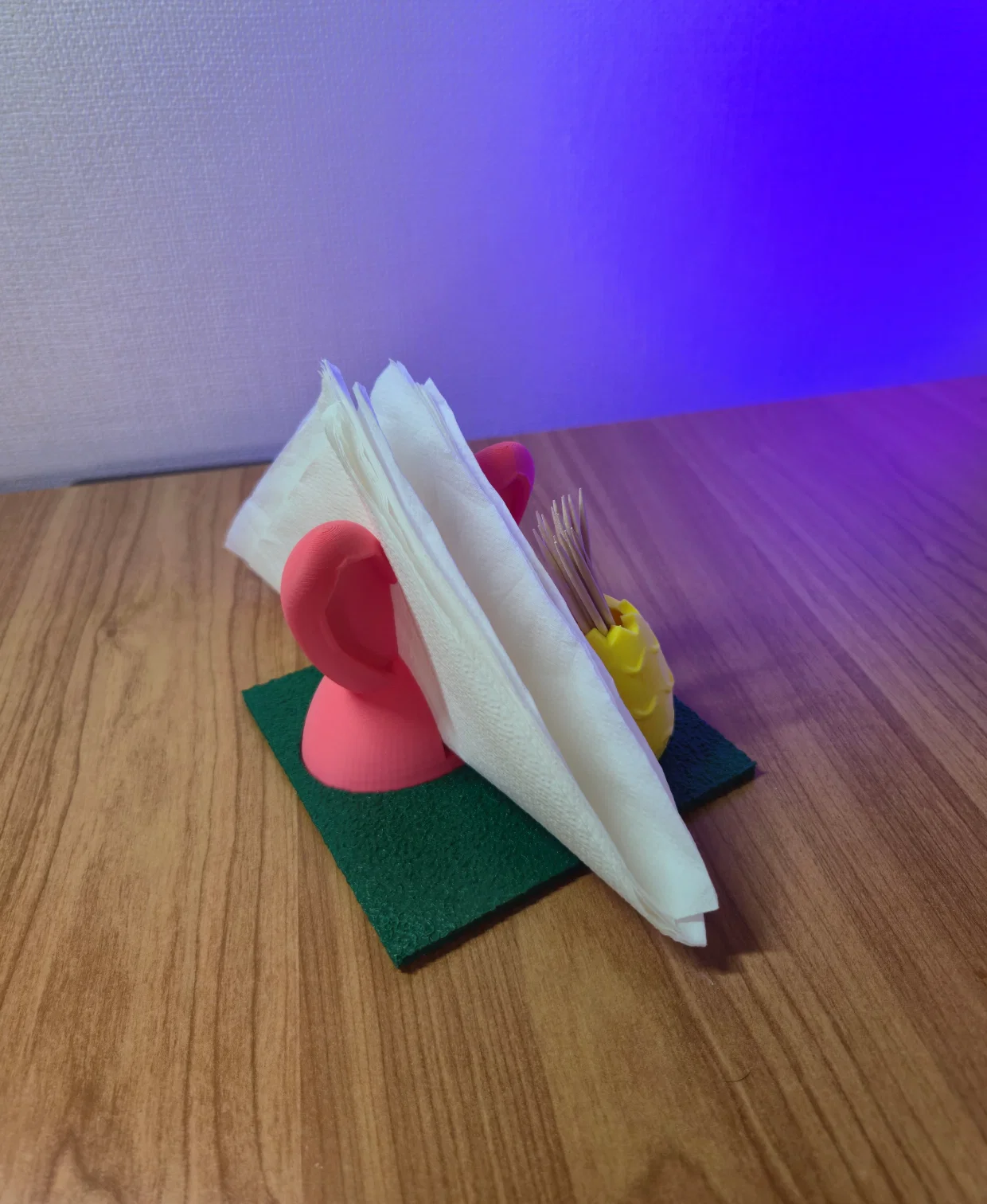 Ở phía sau, đôi tai thỏ dựng đứng đóng vai trò như một khe cắm giúp cố định khăn ăn một cách chắc chắn, vừa dễ dàng lấy ra lại vừa giữ cho bàn ăn luôn gọn gàng. Phía trước, quả trứng nứt rỗng ruột đóng vai trò là ống cắm tăm, vừa tiện lợi vừa duy trì được nét thẩm mỹ vui tươi.