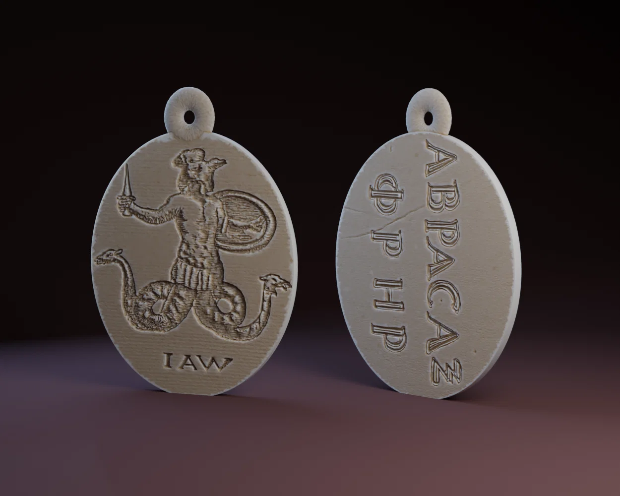 Bên trái của cái tên là một dòng chữ dọc: các chữ cái Hy Lạp PHI và RHO (ΦΡ), phía trên là một chữ 'H' (Eta) và một chữ 'P' (Rho) nhỏ hơn, có thể đọc là ΦΡΗΡ hoặc một biến thể tương tự, thường gắn liền với một linh hồn bảo vệ khác hoặc một yếu tố phép thuật cụ thể. Biểu tượng này ít phổ biến hơn nhưng mang đậm nét của các ký hiệu phép thuật Gnostic và Coptic thông thường. Vật phẩm được hoàn thiện với một khoen treo tích hợp ở đỉnh, cho phép người dùng đeo nó lên người.