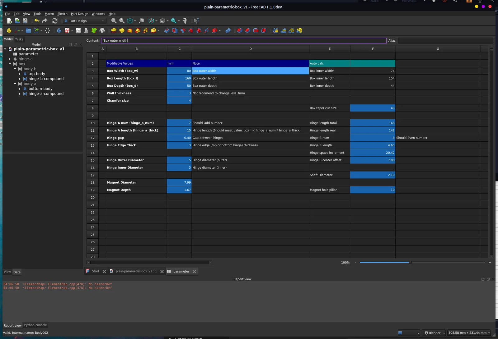 - Mở tệp thiết kế và mở bảng tính (Spreadsheet) trong FreeCAD.