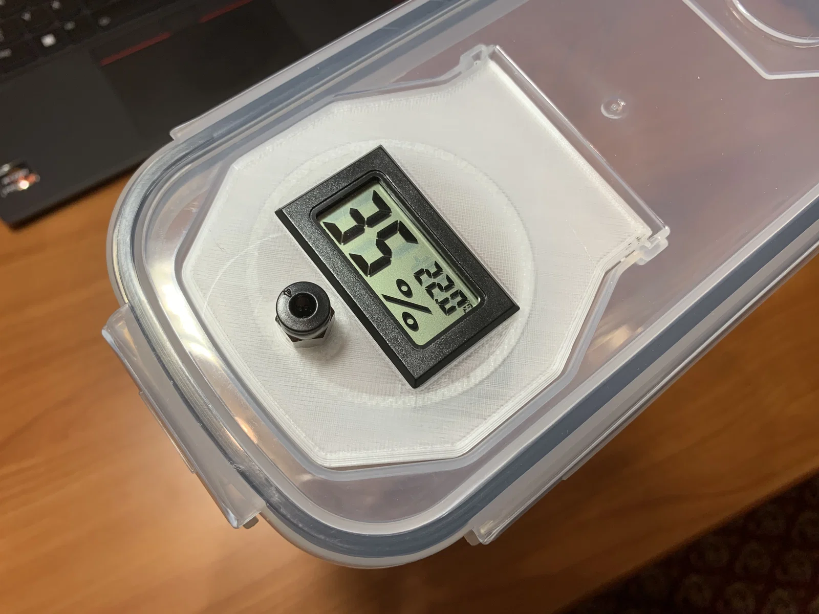 Để bảo quản các loại sợi in (filament) nhạy cảm với độ ẩm (hút ẩm), mọi người thường tận dụng các hộp đựng thực phẩm 4 lít giá rẻ. Những hộp này thường có gioăng cao su giúp cách ly không khí khá tốt. Để không phải lấy sợi ra khỏi hộp khi đang in, chúng ta cần một cách để luồn ống PTFE vào. Cách đơn giản nhất là khoan một lỗ trên nắp hộp, nhưng nếu bạn đã có máy in 3D thì việc in một nắp mới sẽ thẩm mỹ hơn nhiều. Bạn có thể lắp thêm đầu nối PC4-M10 (với ren BSP hoặc ren mịn M10) để dẫn ống PTFE và tích hợp thêm cảm biến đo nhiệt độ, độ ẩm kỹ thuật số ngay trên nắp.