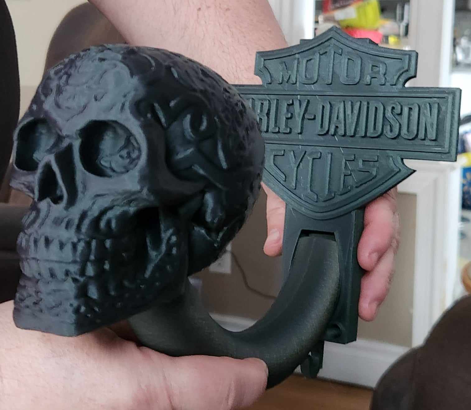 Mẫu giá treo mũ bảo hiểm mô tô phong cách Harley Davidson được remix lại với logo nổi bật và phần đầu lâu được thiết kế to hơn giúp giữ mũ chắc chắn. Mẫu có thể in bằng PLA hoặc PETG, chỉ cần dùng support cho phần tấm gắn tường.