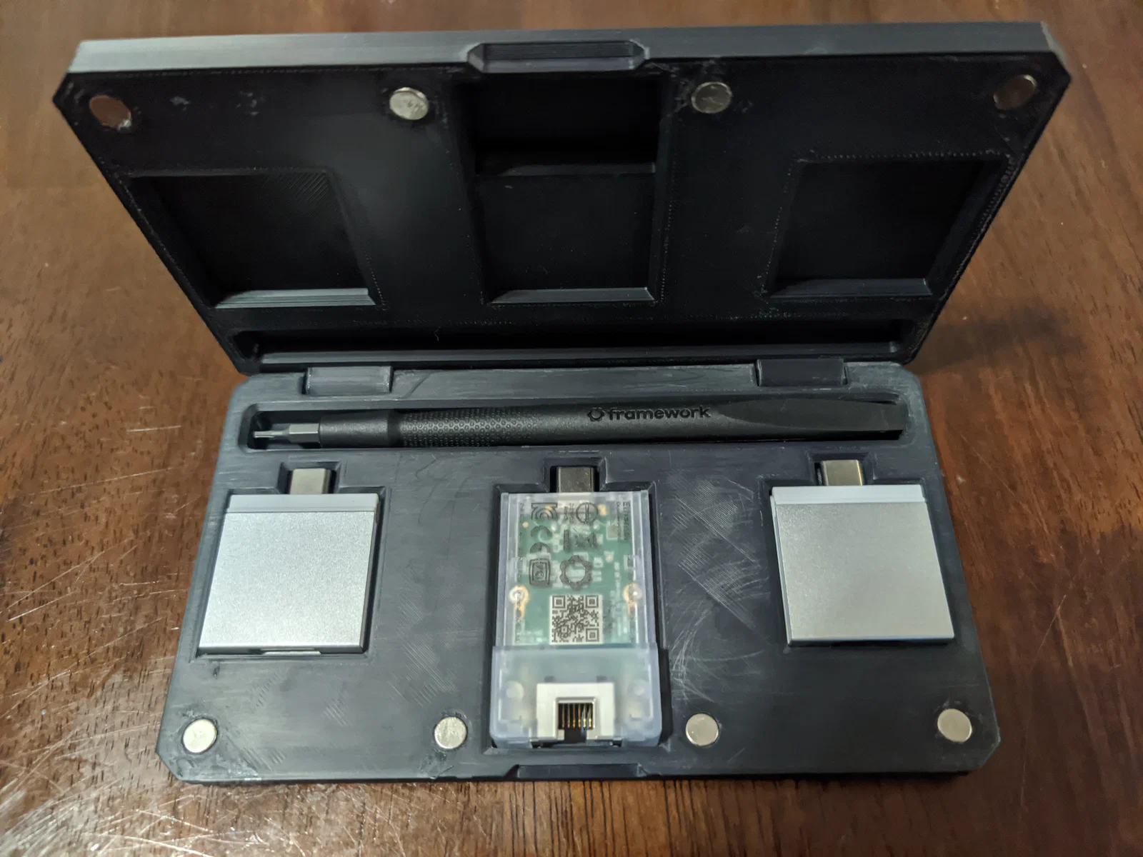 Đây là hộp đựng cho các thẻ mở rộng (expansion card) của laptop Framework. Hộp này có thể chứa hai thẻ mở rộng tiêu chuẩn, một module Ethernet loại lớn, dụng cụ tháo lắp đi kèm, cùng các ngăn phụ (không hiển thị trong ảnh) để đựng ốc vít hoặc phụ kiện nhỏ. Mẫu này được lấy cảm hứng từ thiết kế gốc nhưng đã được thay đổi nhiều chi tiết, điểm đáng chú ý nhất là thiết kế có bản lề giống với phong cách của chiếc laptop.