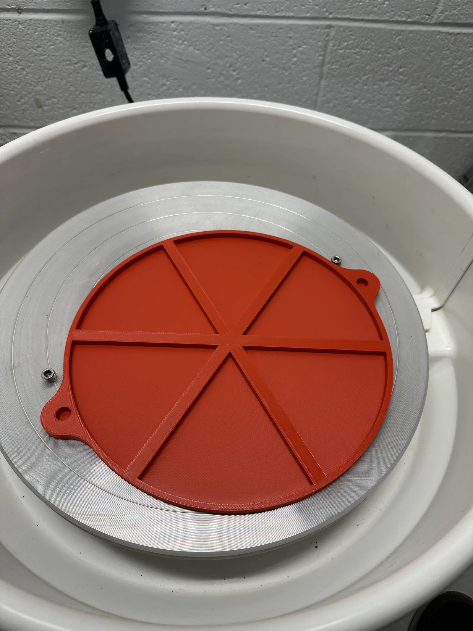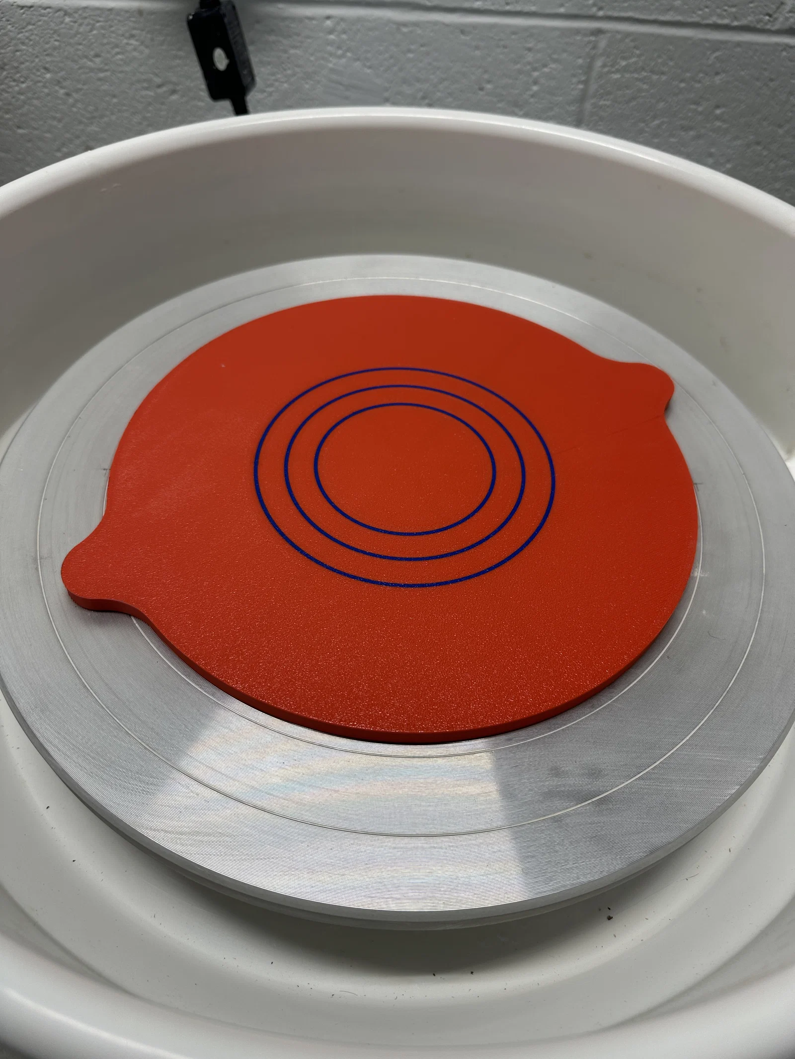 Thiết kế này được tối ưu hóa để tương thích hoàn hảo với các bàn xoay có chốt tâm 10 inch phổ biến. Mặt trên được in phẳng, tích hợp các vòng tròn đồng tâm hỗ trợ người làm gốm căn chỉnh vị trí đất sét một cách chính xác nhất ngay từ bước đầu tiên. Phía dưới tấm đệm được thiết kế các gân gia cường dạng nan hoa, giúp cấu trúc trở nên cứng cáp, chịu lực tốt hơn mà không bị biến dạng khi gặp độ ẩm từ bùn đất.