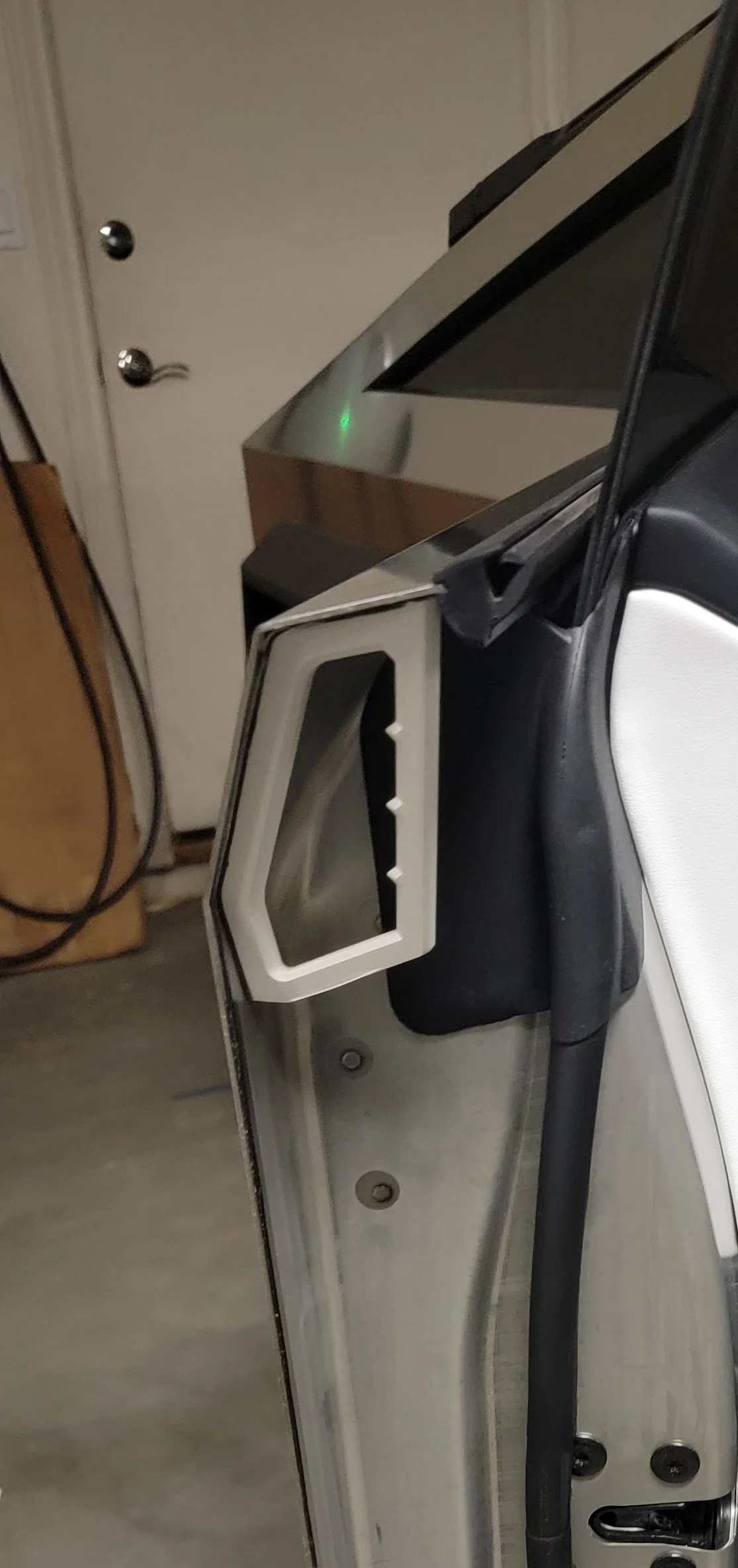 Phần vỏ ngoài HFS của Cybertruck cực kỳ cứng cáp, có thể chịu được đạn súng ngắn và cả C4. Tuy nhiên, bề mặt xe lại rất dễ bám dấu vân tay. Những tay nắm này được thiết kế để gắn vào mặt trong bằng băng dính hai mặt 3M loại chịu lực, giúp bạn có thêm tay cầm tiện lợi để đóng cửa sau khi xuống xe mà không làm bẩn lớp vỏ thép.