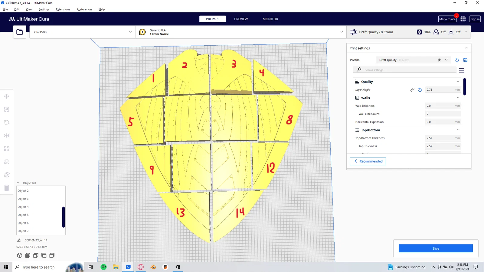 Mình đã cắt phiên bản có lỗ xỏ dây đeo vì bản còn lại sẽ dễ dàng cho mọi người tự cắt theo ý thích hơn, và bạn có thể dùng Windows 3D Builder để sửa các lỗi mà PrusaSlicer không làm được. Mình cũng chưa rõ cách cắt thế nào cho tối ưu, nên nếu mình làm chưa tốt hoặc các bạn thấy có cách nào hay hơn thì cứ thoải mái thực hiện (và hãy đăng bản remix nếu bạn muốn giúp đỡ cộng đồng). Hiện tại, đây là cách tốt nhất mình nghĩ ra được. Mình đã tạo một phiên bản cho máy in nhỏ như Prusa Mini và Ender 2 (~155mm mỗi chiều) gồm 14 mảnh, và một phiên bản cho máy in lớn hơn như CR-10 (~310mm mỗi chiều nhưng đặt chéo trên bàn in) gồm 4 mảnh.