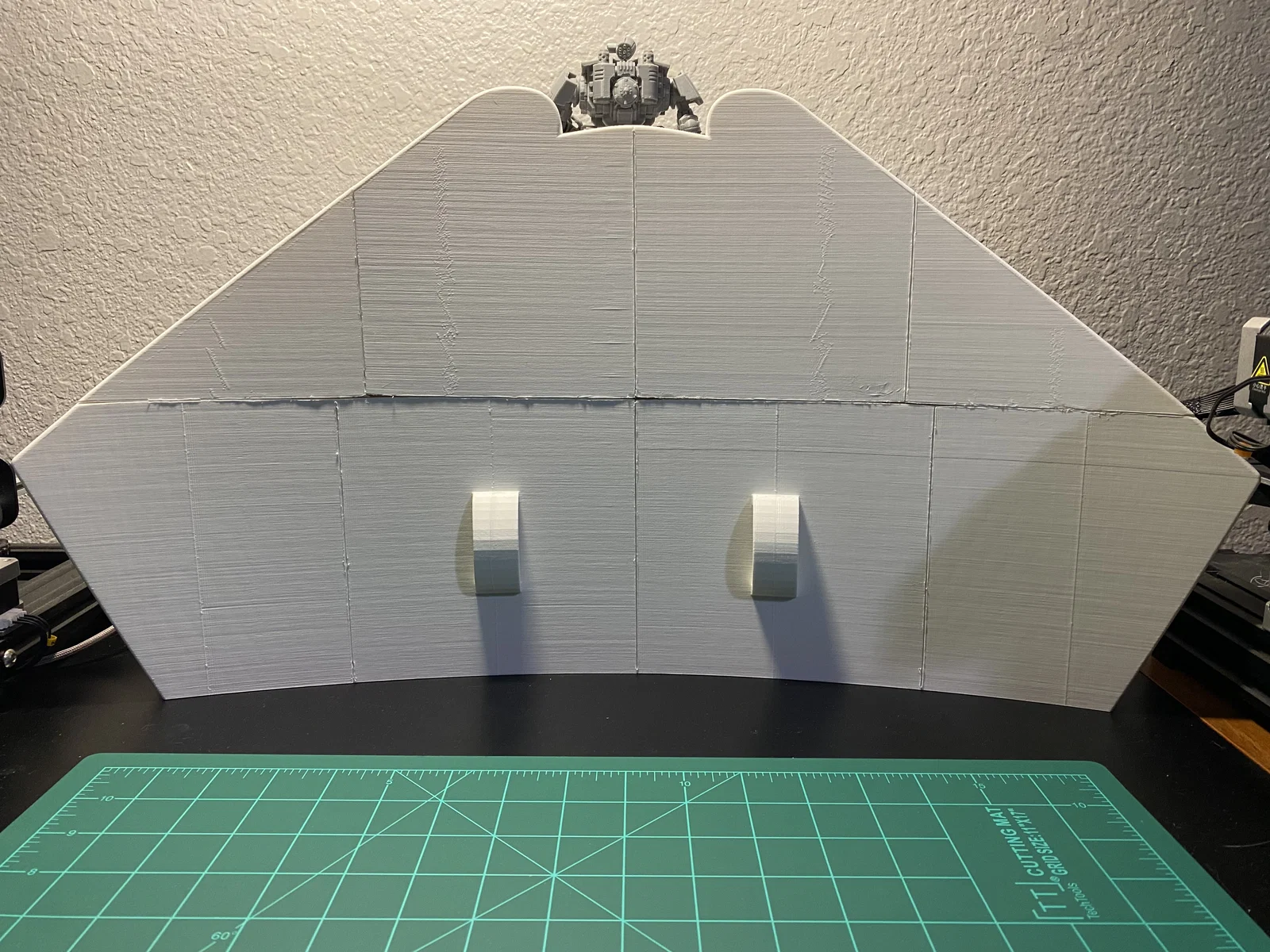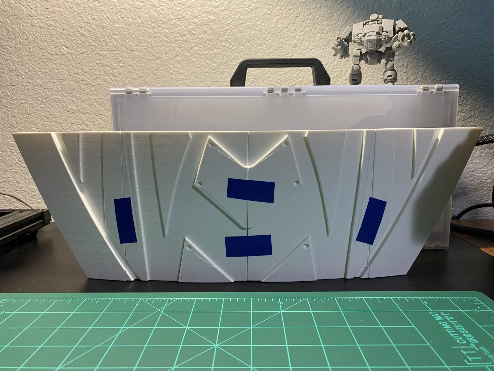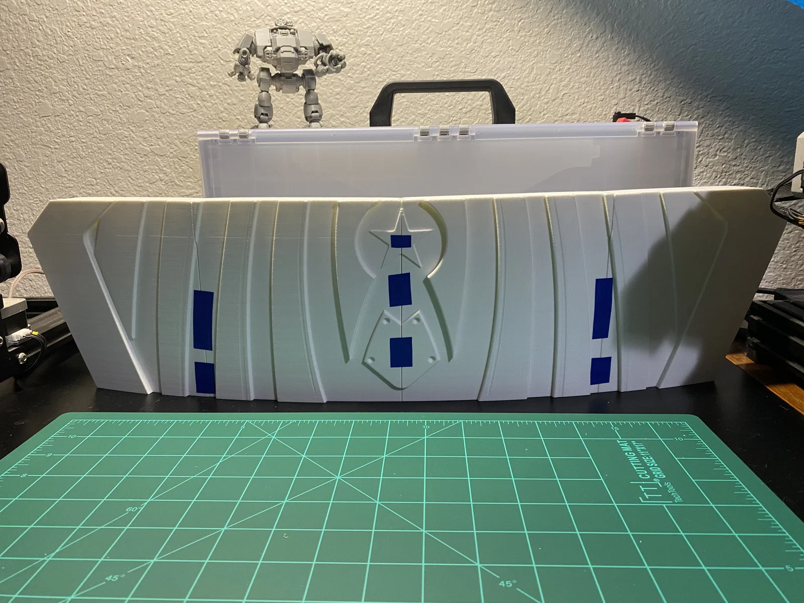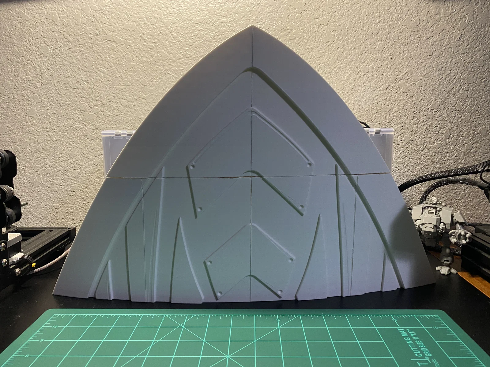 Cập nhật ngày 10/1/2025: Mình đã ghép các mảnh lại thành 2 phần lớn (trên và dưới). Mình dùng băng keo giấy để căn chỉnh mọi thứ hết mức có thể, rồi uốn nhẹ tấm khiên khi hàn các mảnh lại với nhau, tuy nhiên vẫn bị cong vênh đôi chút ở vài vị trí. Chuyện dùng bàn nhiệt kính thỉnh thoảng bị thế là bình thường, mấy chỗ đó dễ dàng trám lại bằng nhựa thừa và mỏ hàn thôi. Mình không có ảnh của hai bước ở giữa, nhưng đại khái là mình dán băng keo một hàng, hàn lại, rồi dán tiếp hai hàng lại với nhau và cứ thế tiếp tục. Đây chắc là cập nhật cuối trong một thời gian dài (như thể lần này cập nhật đúng hạn chứ không phải 4 tháng sau khi bắt đầu vậy), vì đứng chà nhám ở nhiệt độ từ 4°C đến -12°C thì không tốt cho sức khỏe chút nào. Còn nếu ai thấy khó chịu với con dreadnought trong ảnh của mình thì kệ đi, nó dễ thương mà, chính tay mình làm nên mình thắng nhé.