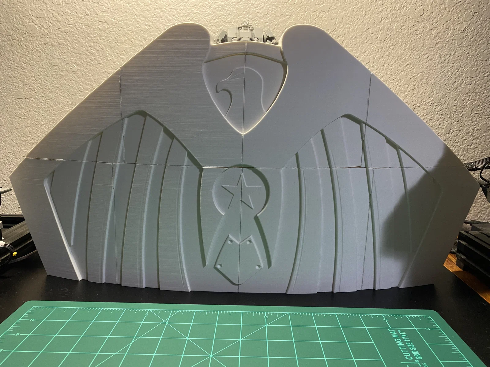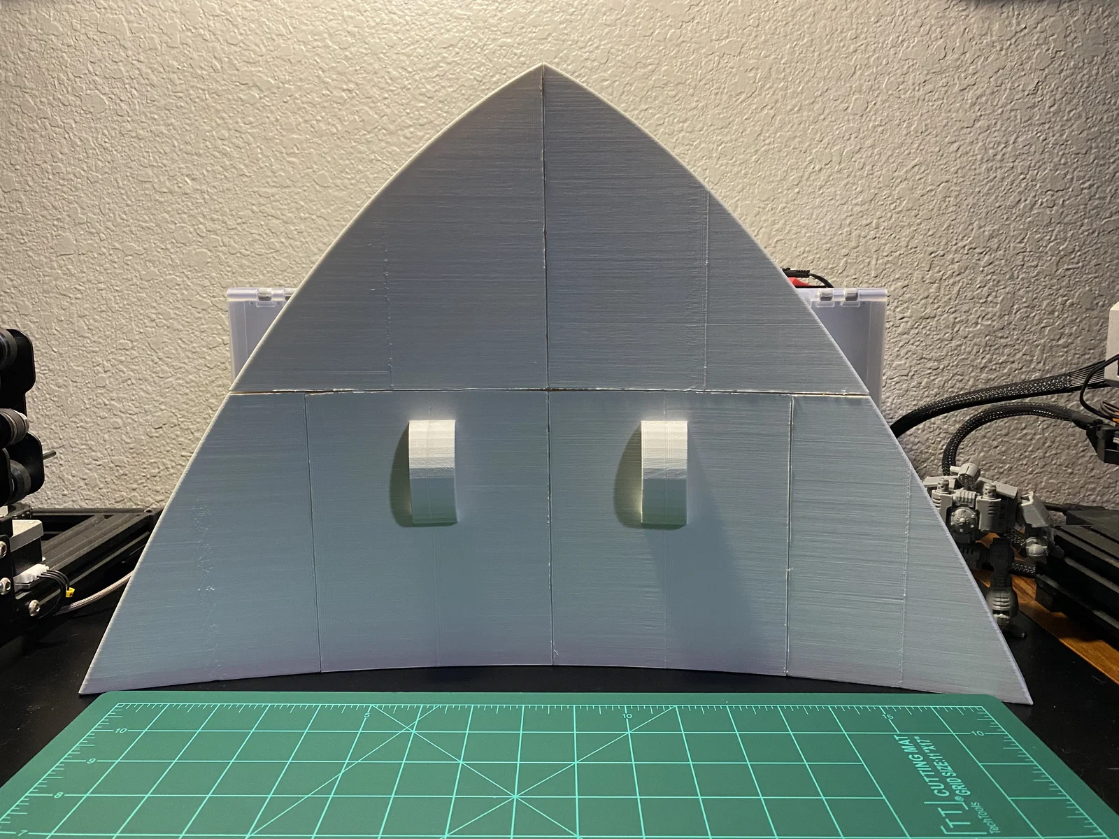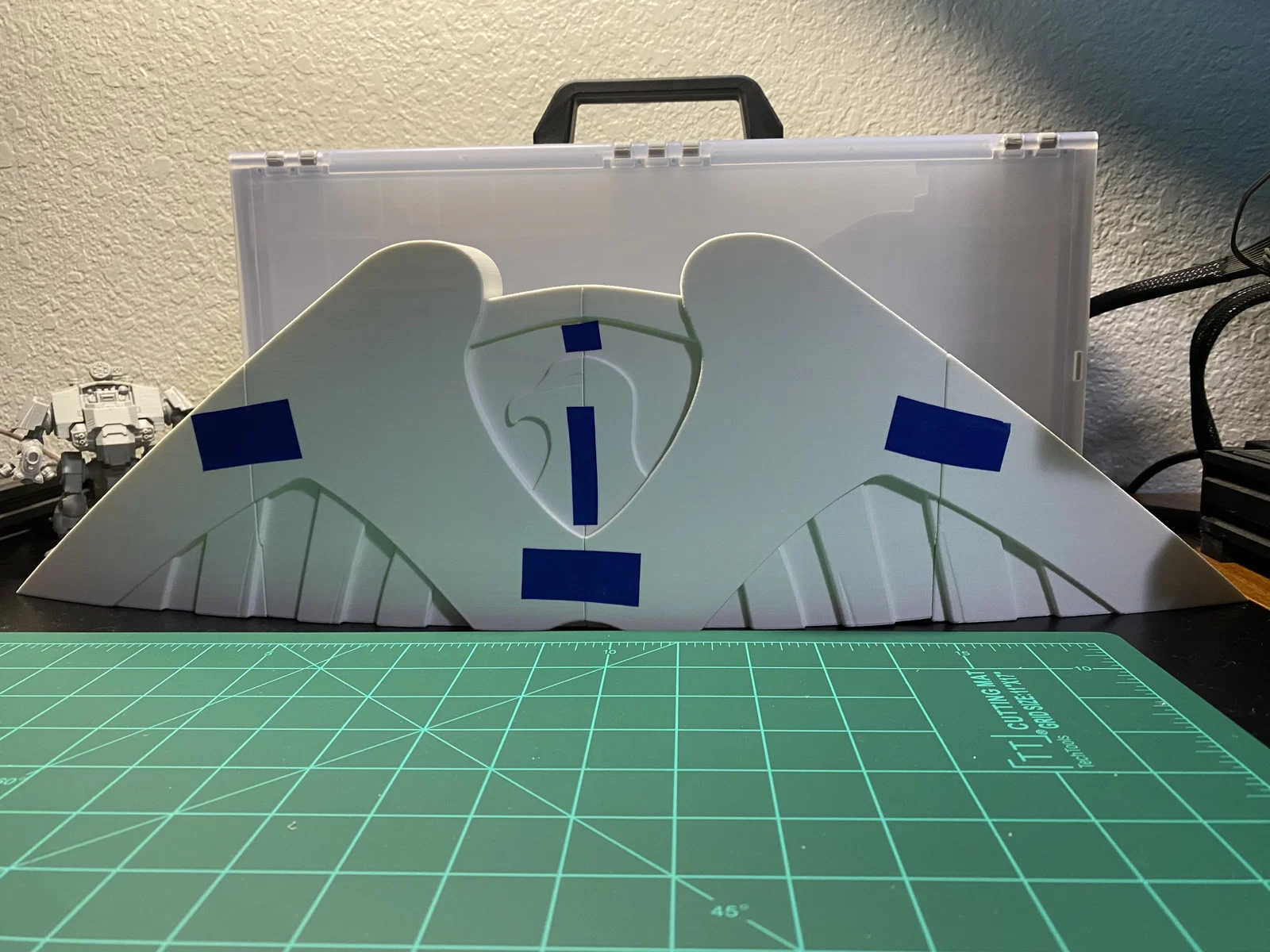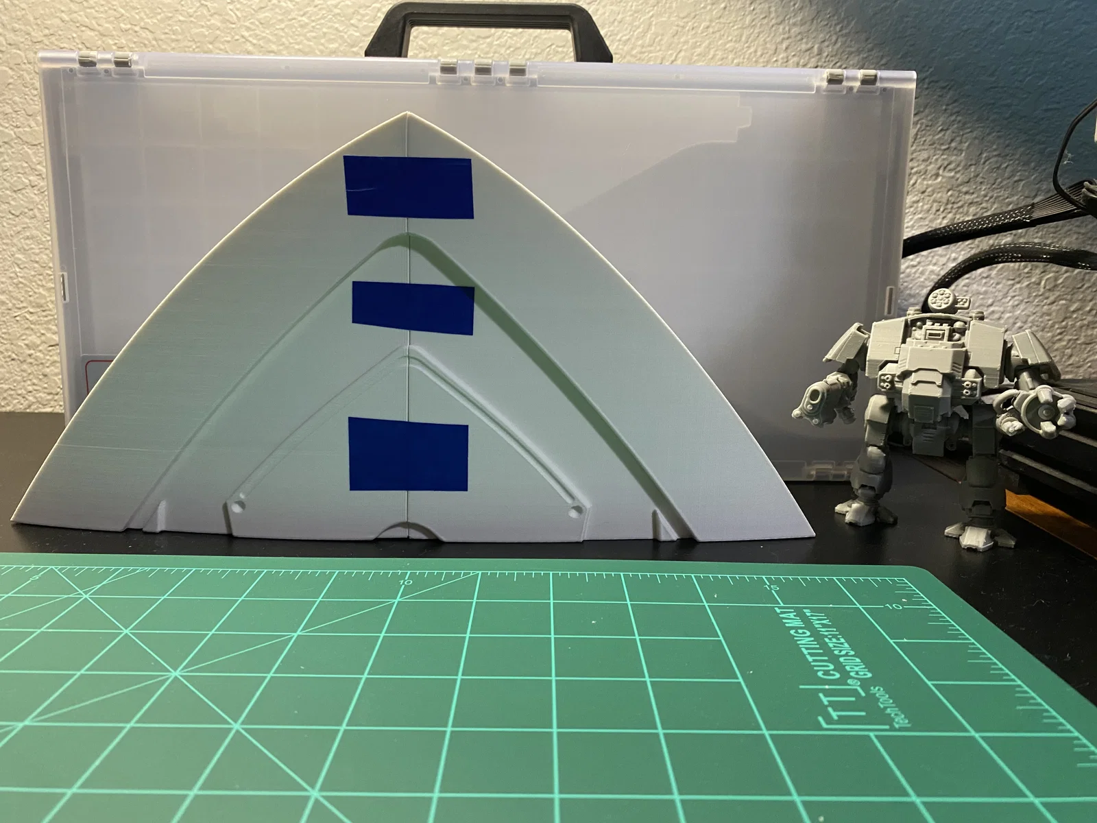 Cập nhật ngày 10/1/2025: Mình đã ghép các mảnh lại thành 2 phần lớn (trên và dưới). Mình dùng băng keo giấy để căn chỉnh mọi thứ hết mức có thể, rồi uốn nhẹ tấm khiên khi hàn các mảnh lại với nhau, tuy nhiên vẫn bị cong vênh đôi chút ở vài vị trí. Chuyện dùng bàn nhiệt kính thỉnh thoảng bị thế là bình thường, mấy chỗ đó dễ dàng trám lại bằng nhựa thừa và mỏ hàn thôi. Mình không có ảnh của hai bước ở giữa, nhưng đại khái là mình dán băng keo một hàng, hàn lại, rồi dán tiếp hai hàng lại với nhau và cứ thế tiếp tục. Đây chắc là cập nhật cuối trong một thời gian dài (như thể lần này cập nhật đúng hạn chứ không phải 4 tháng sau khi bắt đầu vậy), vì đứng chà nhám ở nhiệt độ từ 4°C đến -12°C thì không tốt cho sức khỏe chút nào. Còn nếu ai thấy khó chịu với con dreadnought trong ảnh của mình thì kệ đi, nó dễ thương mà, chính tay mình làm nên mình thắng nhé.