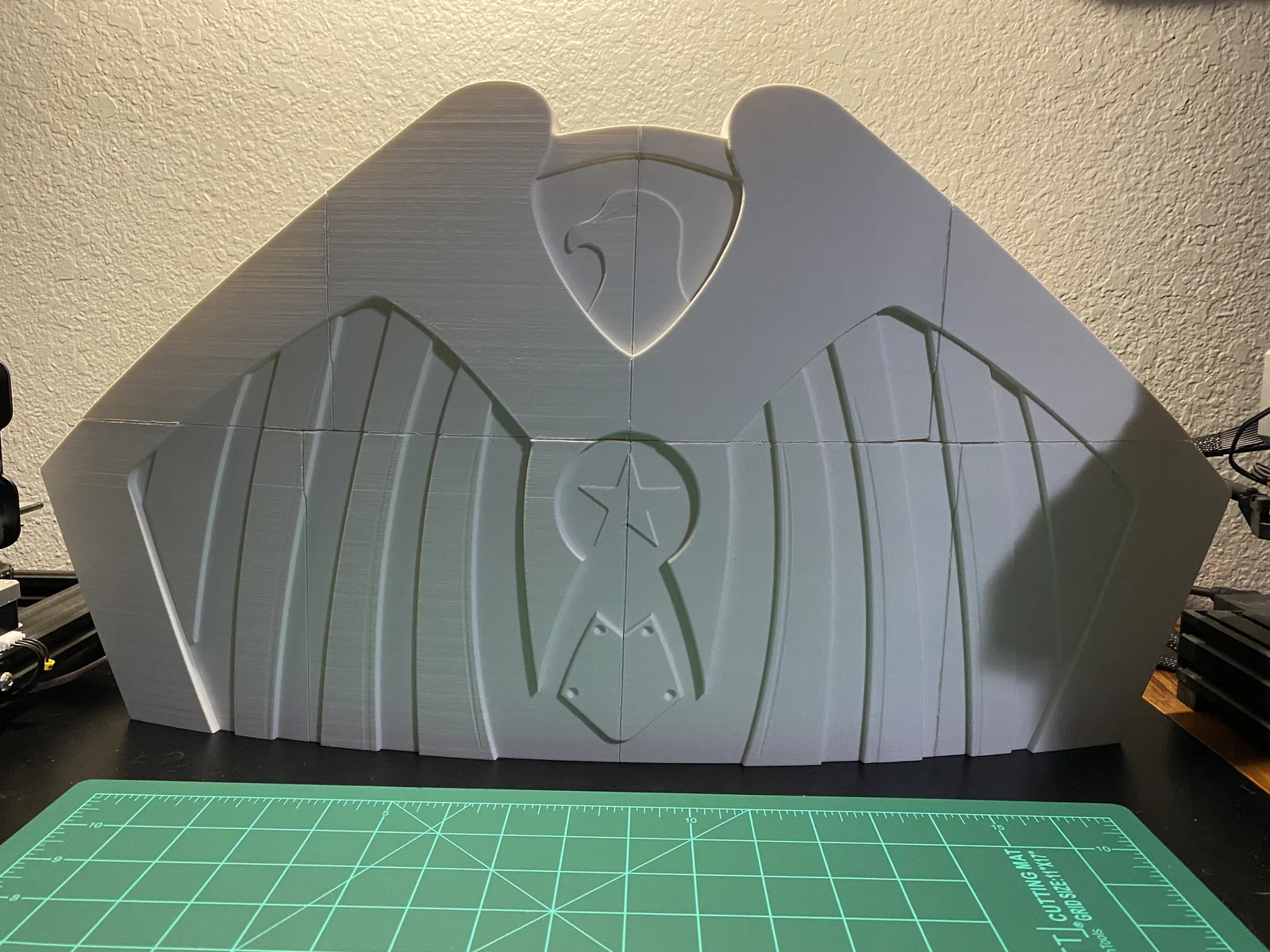 Cái khiên này khá to, kích thước 63cm x 63cm tại các điểm dài và rộng nhất. Nó khá chính xác về tỷ lệ vì mình đã dùng một bức ảnh có người đếm pixel để làm tham chiếu kích thước. Độ dày cũng khá chuẩn ở mức đúng 3cm.