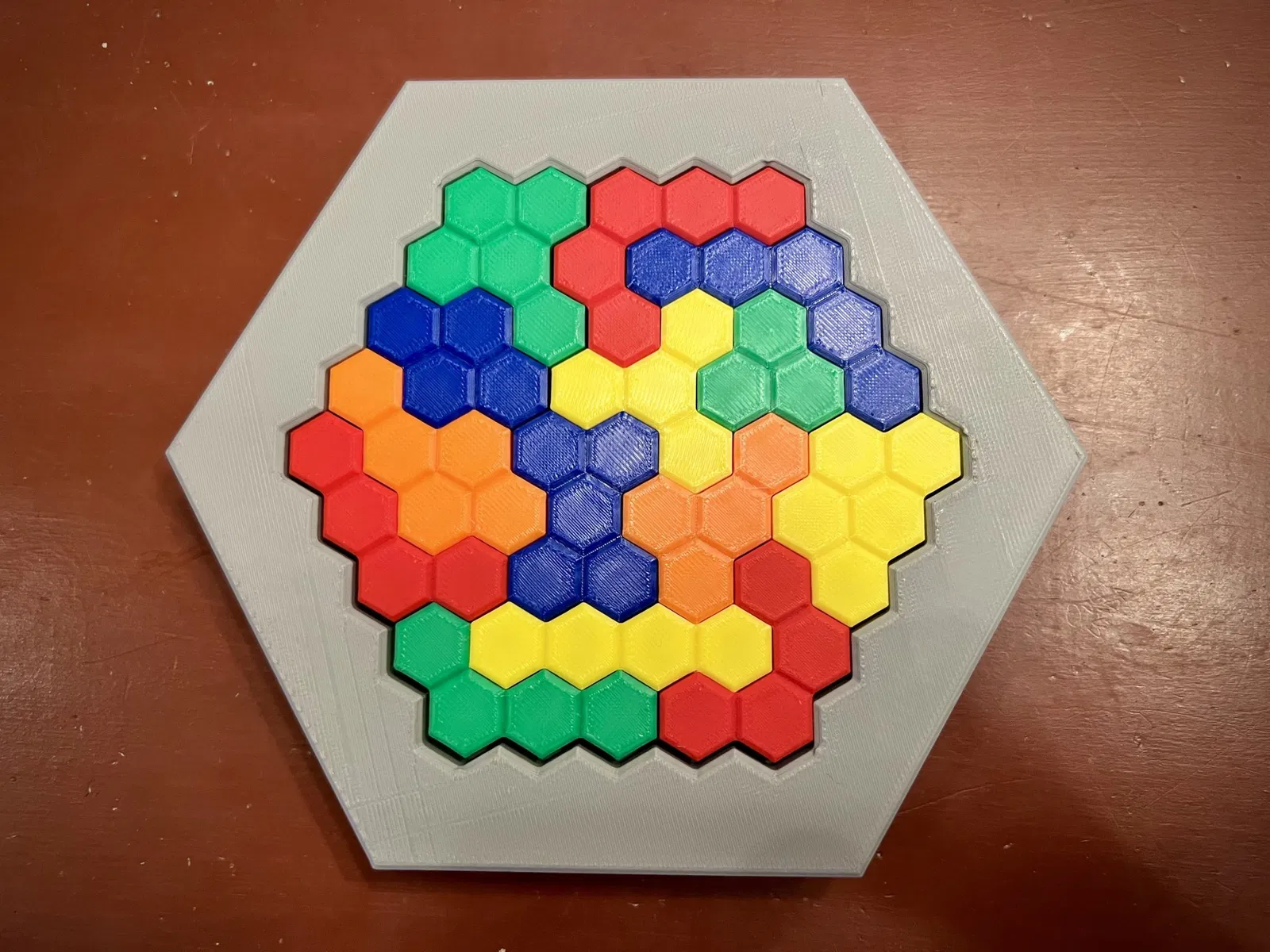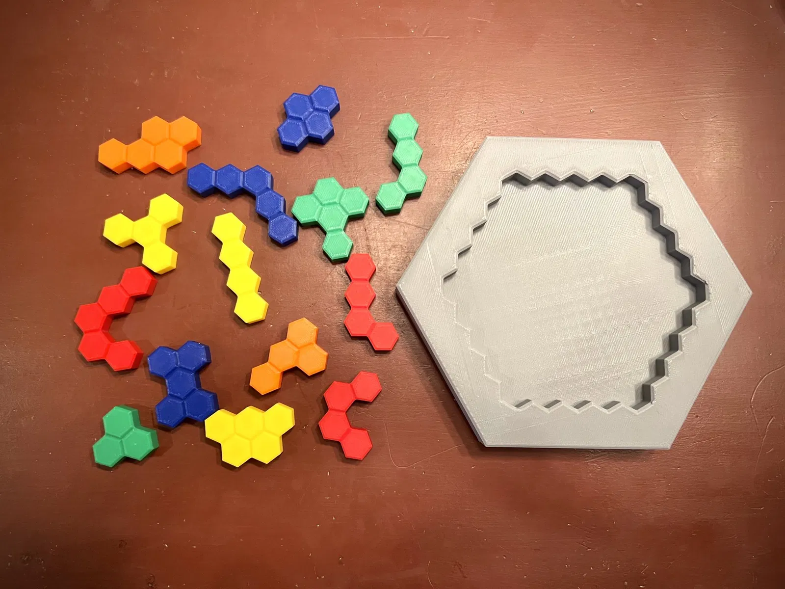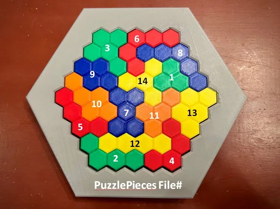 Mô hình này là cho một trò chơi đố hình lục giác với bảng trò chơi và 14 mảnh ghép. Tôi đã bao gồm các tệp riêng cho từng mảnh ghép. Tôi cũng đã bao gồm một bức ảnh liên kết mỗi mảnh ghép với số tệp. Hãy thoải mái in theo bất kỳ mẫu màu nào bạn chọn. Tôi đã in các tệp 1-3 với màu xanh, 4-6 với màu đỏ, 7-9 với màu xanh dương, 10-11 với màu cam, và 12-14 với màu vàng.