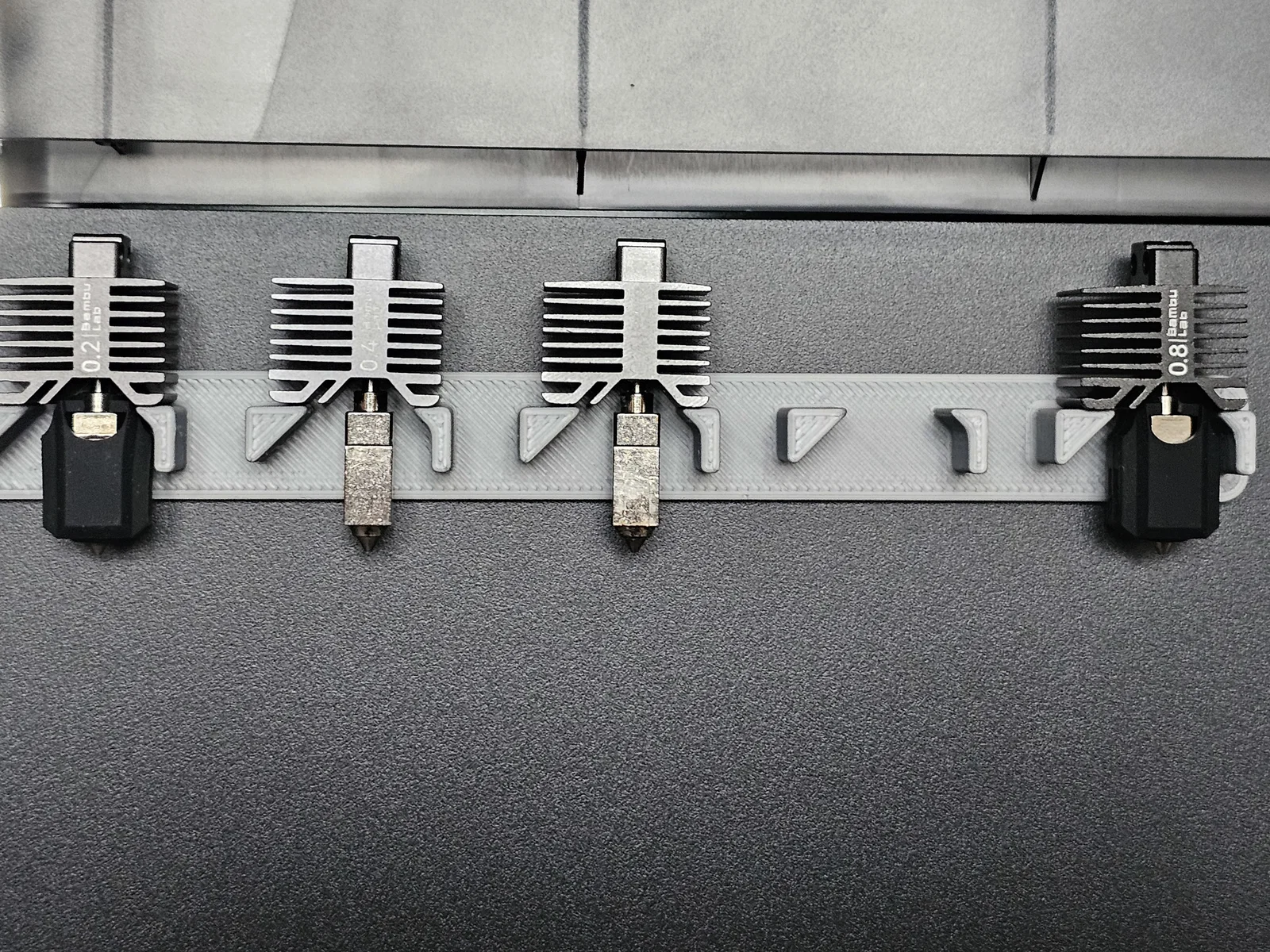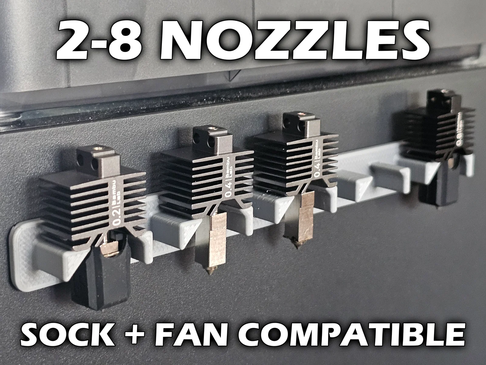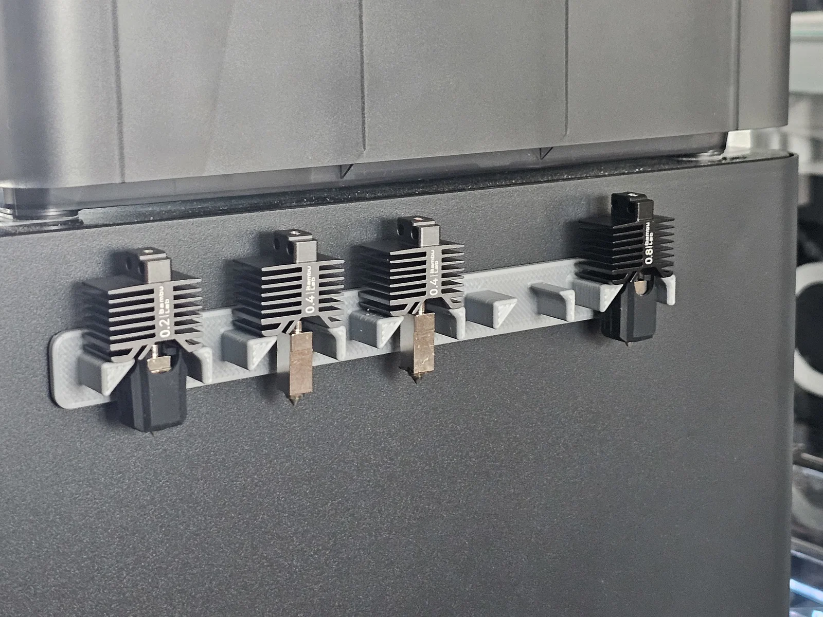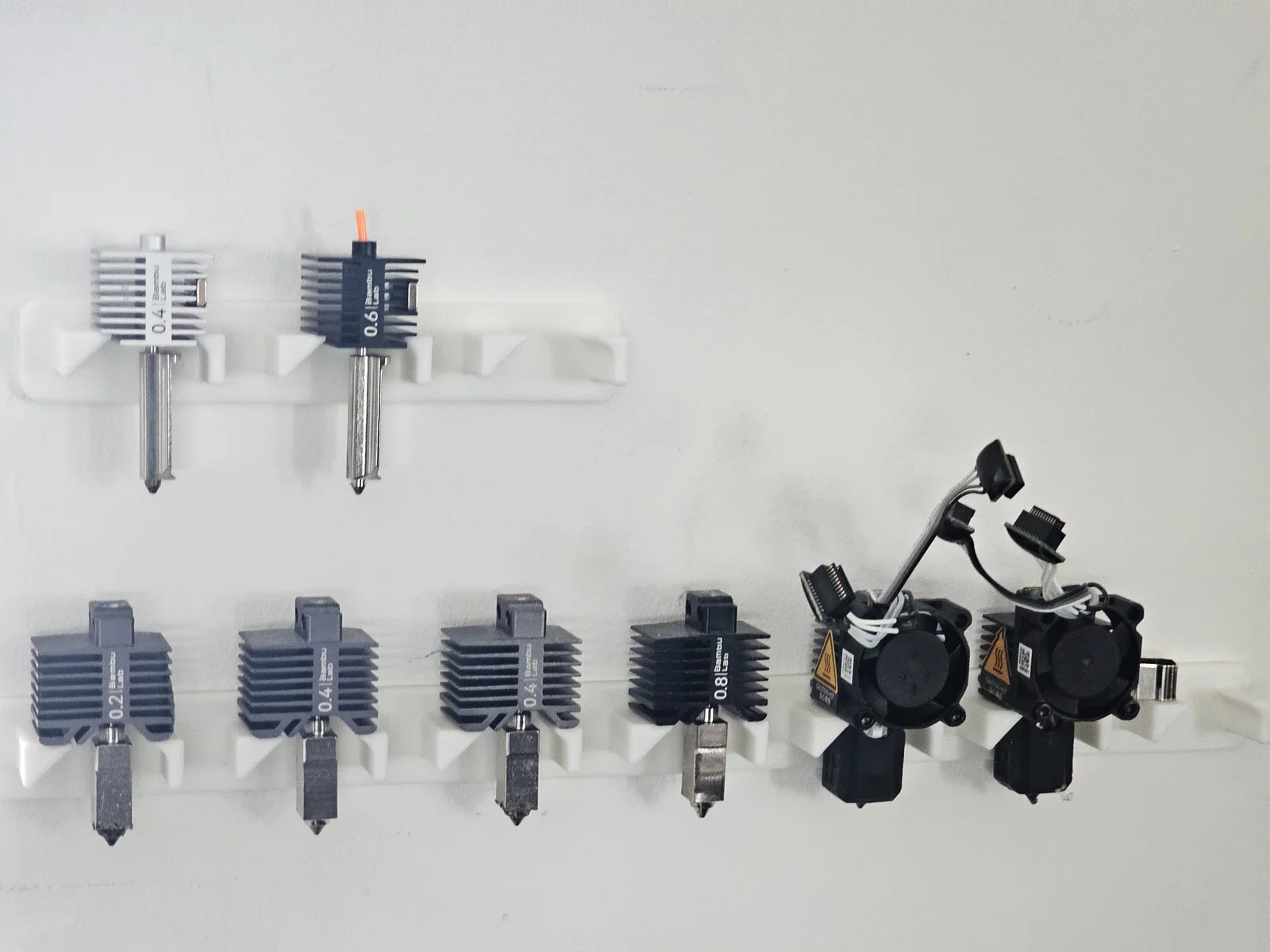 Điểm đặc biệt của thiết kế này là tính tương thích cực cao với các linh kiện của Bambu Lab. Dù đầu phun của bạn có đang gắn kèm tất silicon (socks) bảo vệ hay quạt tản nhiệt, chúng vẫn có thể đặt vừa vặn vào các khe đỡ mà không gặp bất kỳ trở ngại nào. Việc lấy ra hoặc cất vào cực kỳ nhanh chóng, giúp bạn tiết kiệm thời gian đáng kể trong quá trình thay đổi thông số in ấn cho các dự án khác nhau. Bạn chỉ cần cố định giá treo lên vị trí mong muốn bằng băng dính hai mặt (double-sided tape) là đã có ngay một bộ lưu trữ chuyên nghiệp.