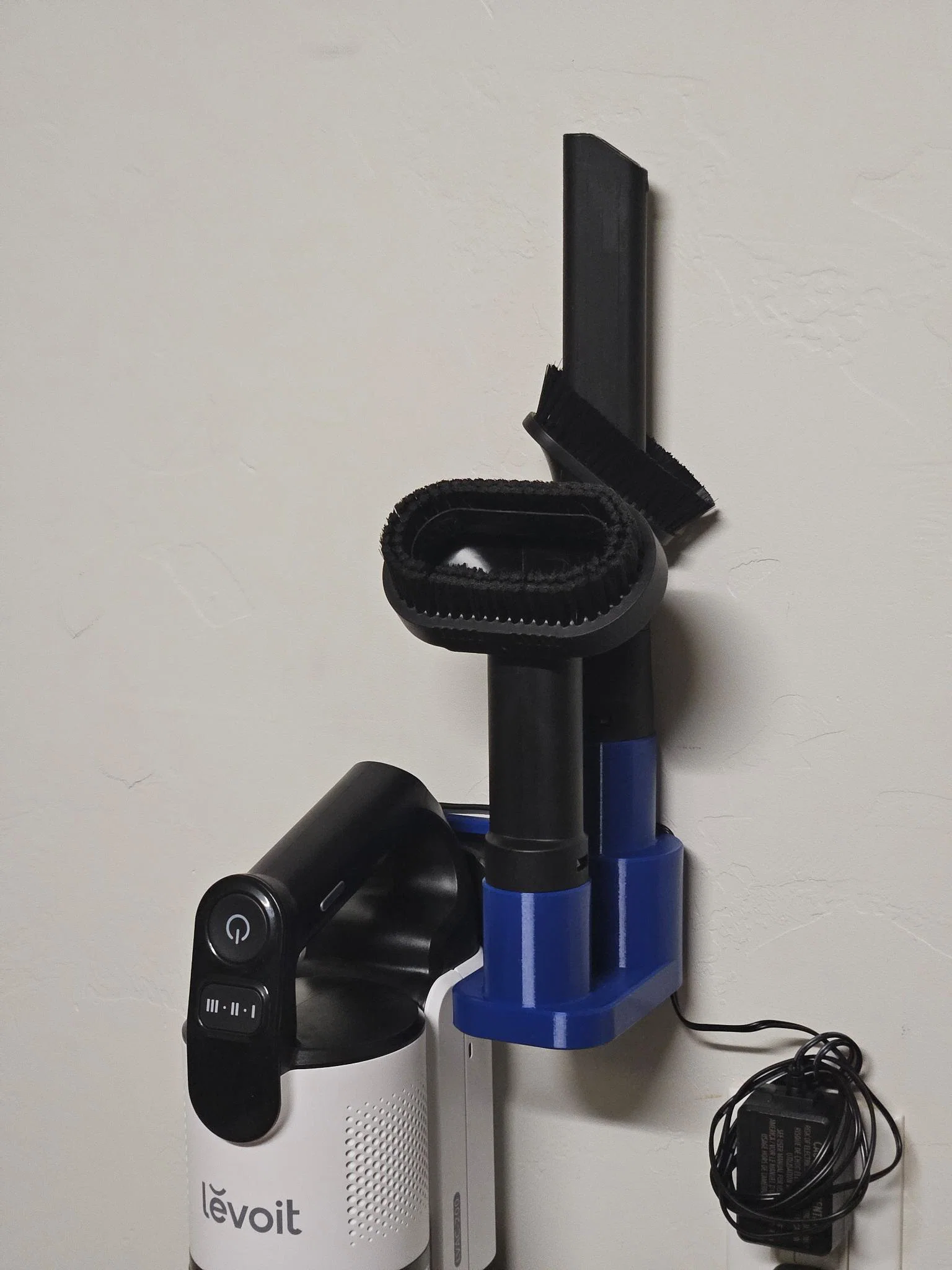Giải pháp thiết kế ngàm gắn tiện lợi cho máy hút bụi Levoit LVAC-200. Sản phẩm giúp bạn sắp xếp gọn gàng các đầu hút, thân máy và dây nguồn ngay trên móc treo tường sẵn có. Phù hợp để in bằng PLA hoặc PETG.