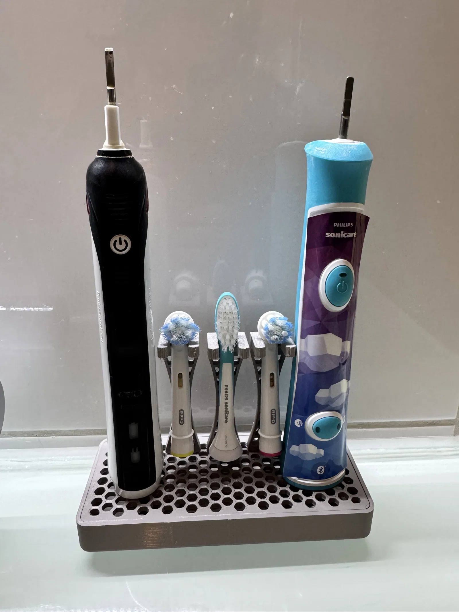 Giá đỡ bàn chải điện với thiết kế mô-đun linh hoạt, hỗ trợ cả dòng Oral-B, iO và Philips Sonicare. Sản phẩm giúp giữ bàn chải gọn gàng, có thêm khay chứa đầu bàn chải thay thế, phù hợp in bằng PLA hoặc PETG.