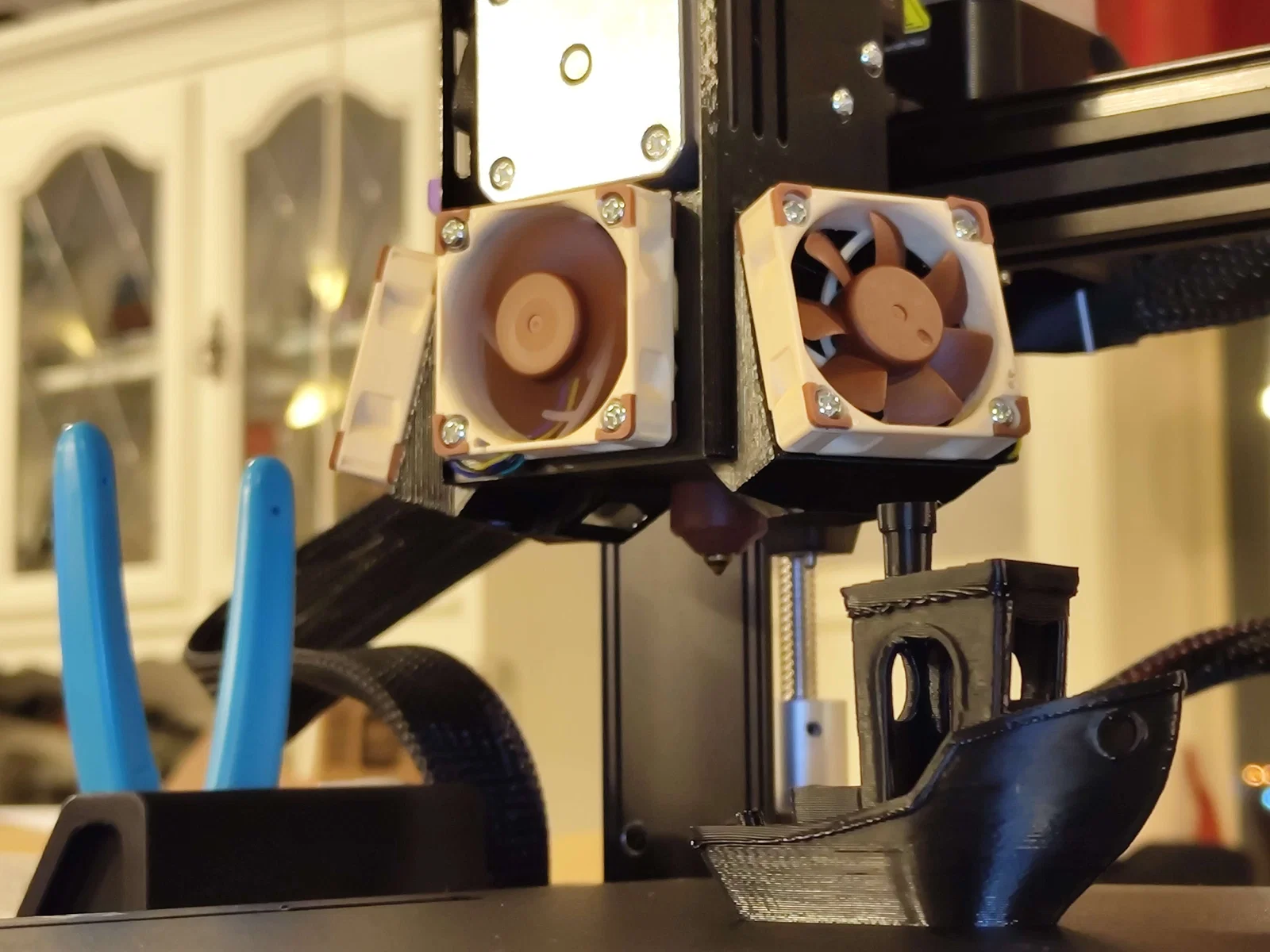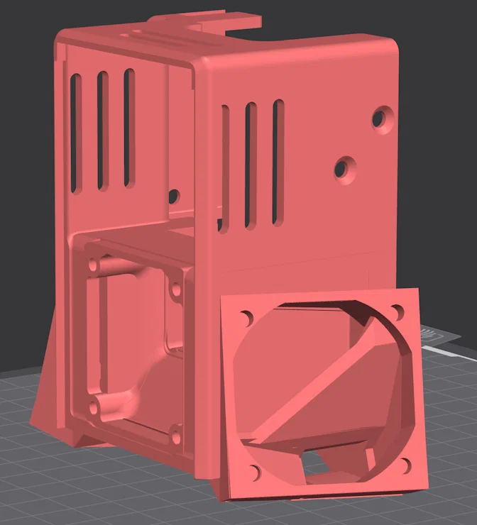 Như đã đề cập ở trên, đây là bộ khung quạt (shroud) đã được chỉnh sửa để lắp vừa ba quạt 40x10. Thiết kế này có cấu trúc thấp cho đầu in (hot end), giúp luồng khí di chuyển ngắn hơn và mang lại vẻ ngoài gọn gàng hơn. Ngoài ra, quạt làm mát đầu phun được xoay dọc với cửa thoát khí tùy chỉnh để đạt hiệu quả làm mát tối ưu.