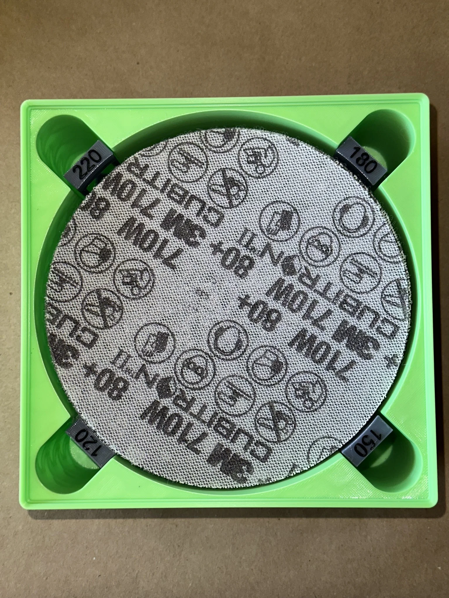 Đây là mẫu thùng đựng giấy nhám 150mm theo hệ Gridfinity kích thước 4x4. Thùng này giúp mình lưu trữ được 5 loại nhám khác nhau, có kèm khay với phần tai cầm để bạn dễ dàng nhấc cả xấp giấy nhám lên và lấy được loại mình cần. Phía trên còn có một nắp đậy riêng để bạn để những tờ giấy nhám đang dùng dở.