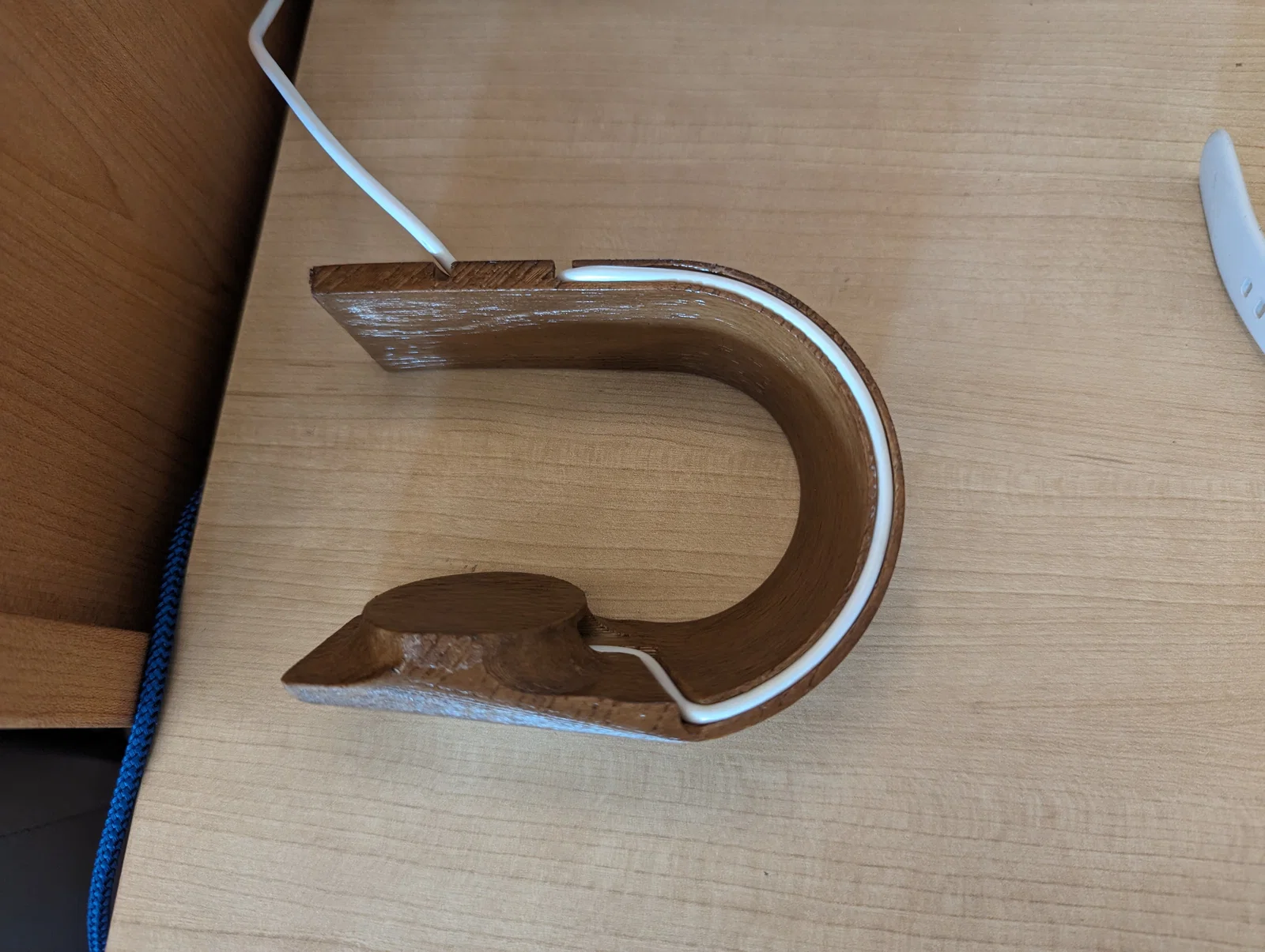 Khi in, bạn hãy đặt mặt trước của đế xuống bàn in với đường đi dây hướng lên trên. Mình có thêm một ít tree supports nhẹ ở khu vực đặt củ sạc. Ngoài ra, mình sử dụng tính năng variable layer height để vân gỗ trông sắc nét hơn.