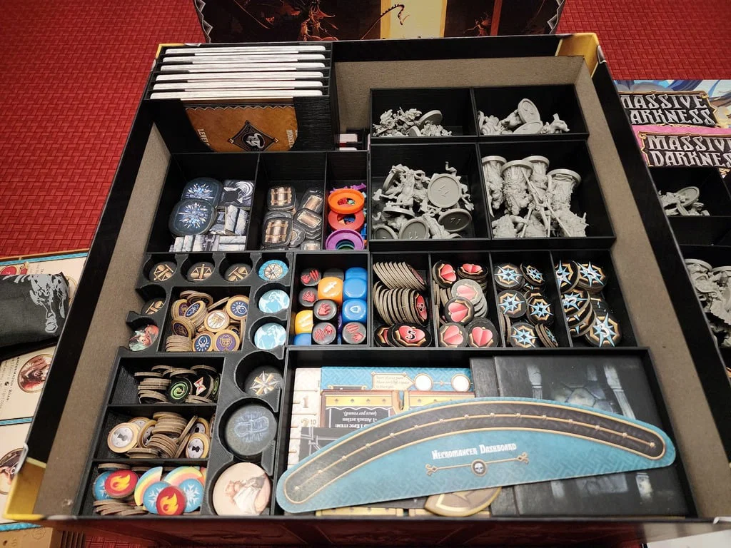 Bản remix bộ organizer cho Massive Darkness 2 giúp tối ưu không gian, nhét gọn tất cả các thành phần Heavenfall Pledge và bản mở rộng vào số lượng hộp ít nhất có thể. Lưu ý: Không dùng cho bài có bọc (sleeve) và các mô hình mini sẽ xếp chồng lên nhau.