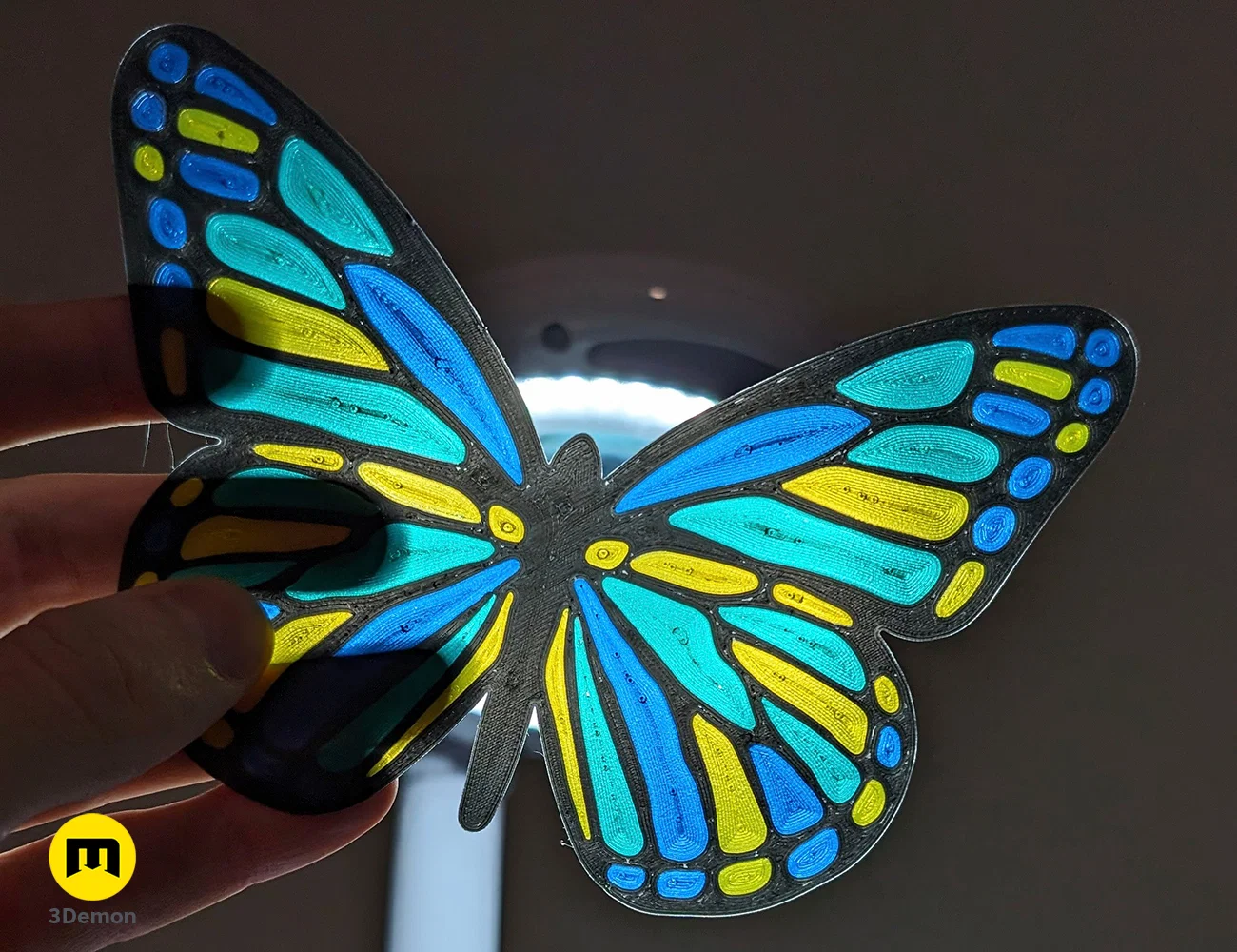 Tạo vật phẩm trang trí hình bướm phong cách kính màu độc đáo. Mẫu in tương thích với cả máy in đa màu (AMS/MMU) và máy in đùn đơn thông thường, cực kỳ tiết kiệm nhựa và dễ thực hiện cho người mới.