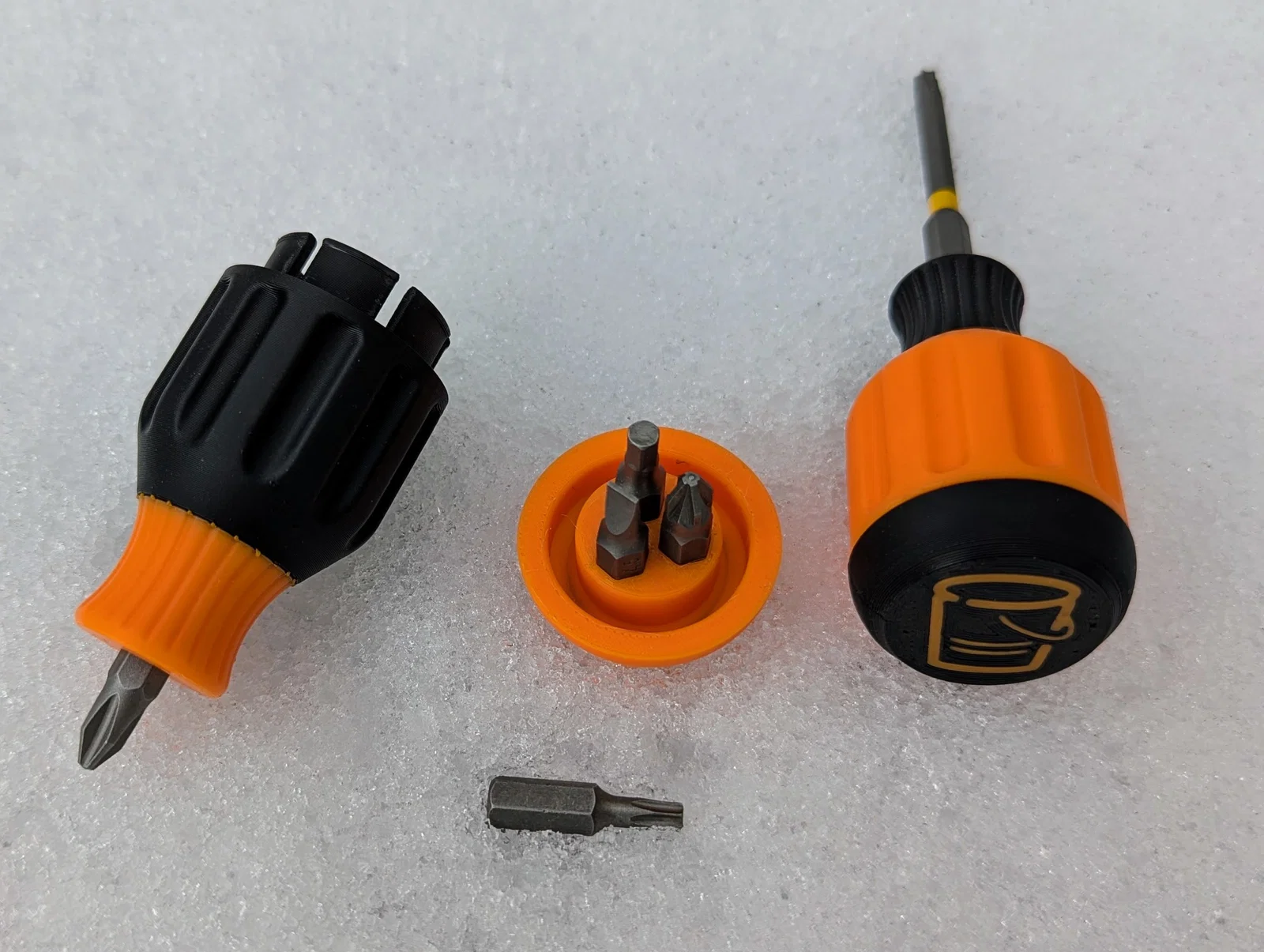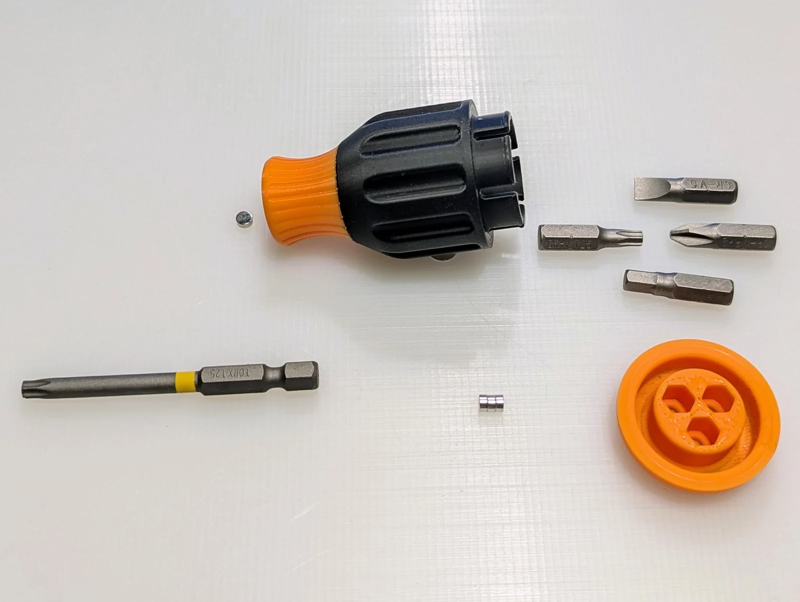 Một chiếc tay cầm tua vít loại ngắn gọn nhẹ, tiện lợi cho việc tháo lắp các đầu bit 1/4 inch. Sản phẩm sử dụng nam châm Ø4x2mm để giữ chắc đầu bit, có kèm khay chứa bit bên trong và thiết kế nắp xoay thông minh. Dễ in, không cần support.