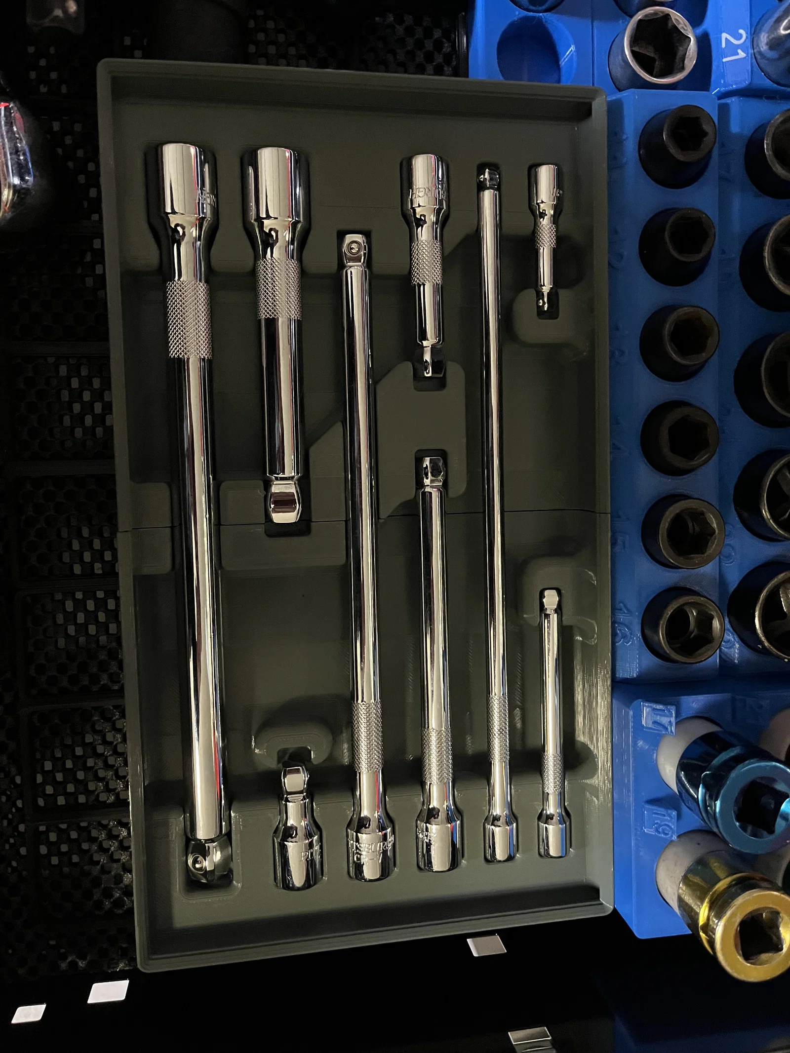 Mình đã tìm kiếm một bộ khay đựng đầu nối (extension) ưng ý nhưng thấy đa số các loại trên thị trường đều chiếm quá nhiều diện tích thừa, không thực tế lắm. Sau đó, mình nhớ ra hệ thống Gridfinity vốn được thiết kế để có thể chồng lên nhau. Vì vậy, mình đã tự thiết kế khay cơ sở này cho bộ 9 đầu nối wobble (wobble extensions) của Harbor Freight, tập trung vào khả năng chồng tầng và giúp lấy dụng cụ ra dễ dàng. Tuy nhiên, khay này vẫn còn hơi nhiều không gian thừa một chút, nhưng so với lượng dụng cụ mà nó chứa được trong cùng một diện tích thì mình nghĩ đây là một sự thỏa hiệp hợp lý. Mình có đính kèm file .stp để bạn nào muốn có thể remix lại mẫu này. Dự định sắp tới của mình là sẽ làm thêm một khay nữa đặt chồng lên trên để đựng các đầu nối thẳng (straight extensions) với cùng kích thước đáy.