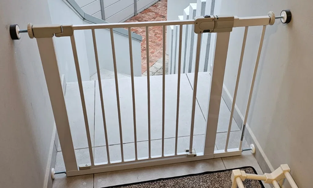 Phần mở rộng cổng Safety 1st của mình bị thiếu đúng 20 mm ở các tay gắn phía trên. Miếng đệm (spacer) này hiện đang giữ cố định chiếc cổng một cách chắc chắn.