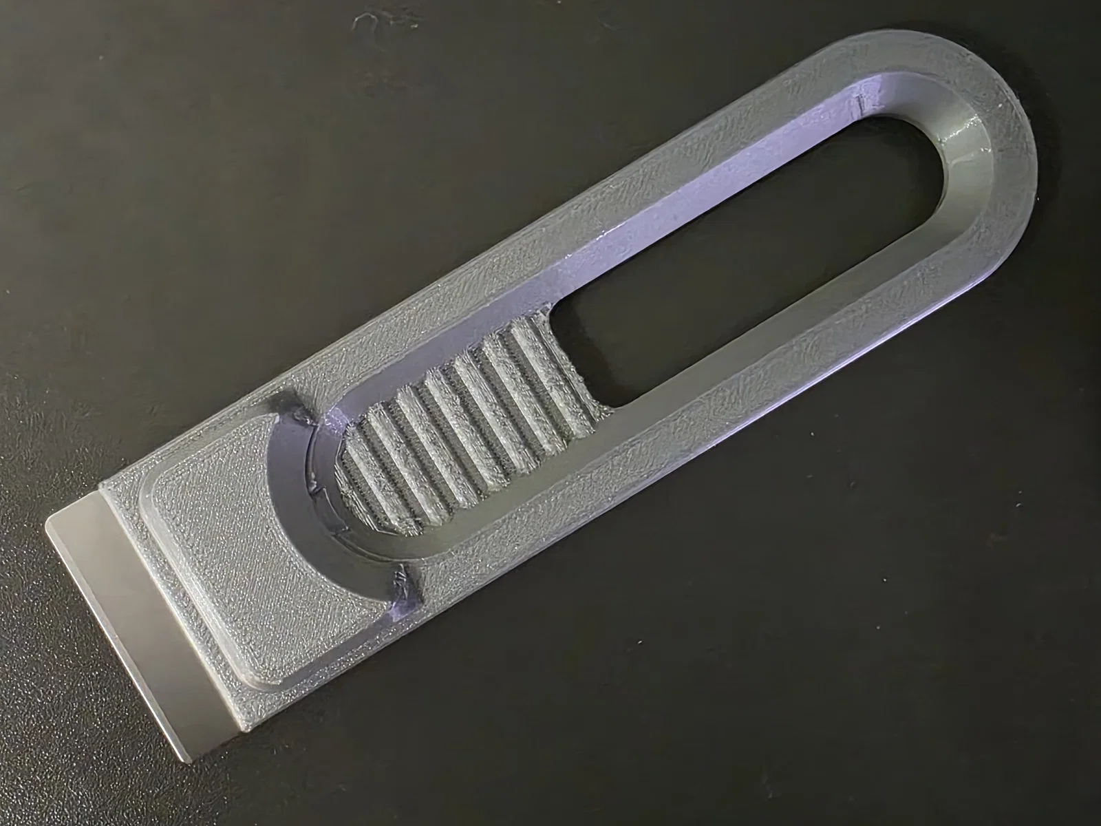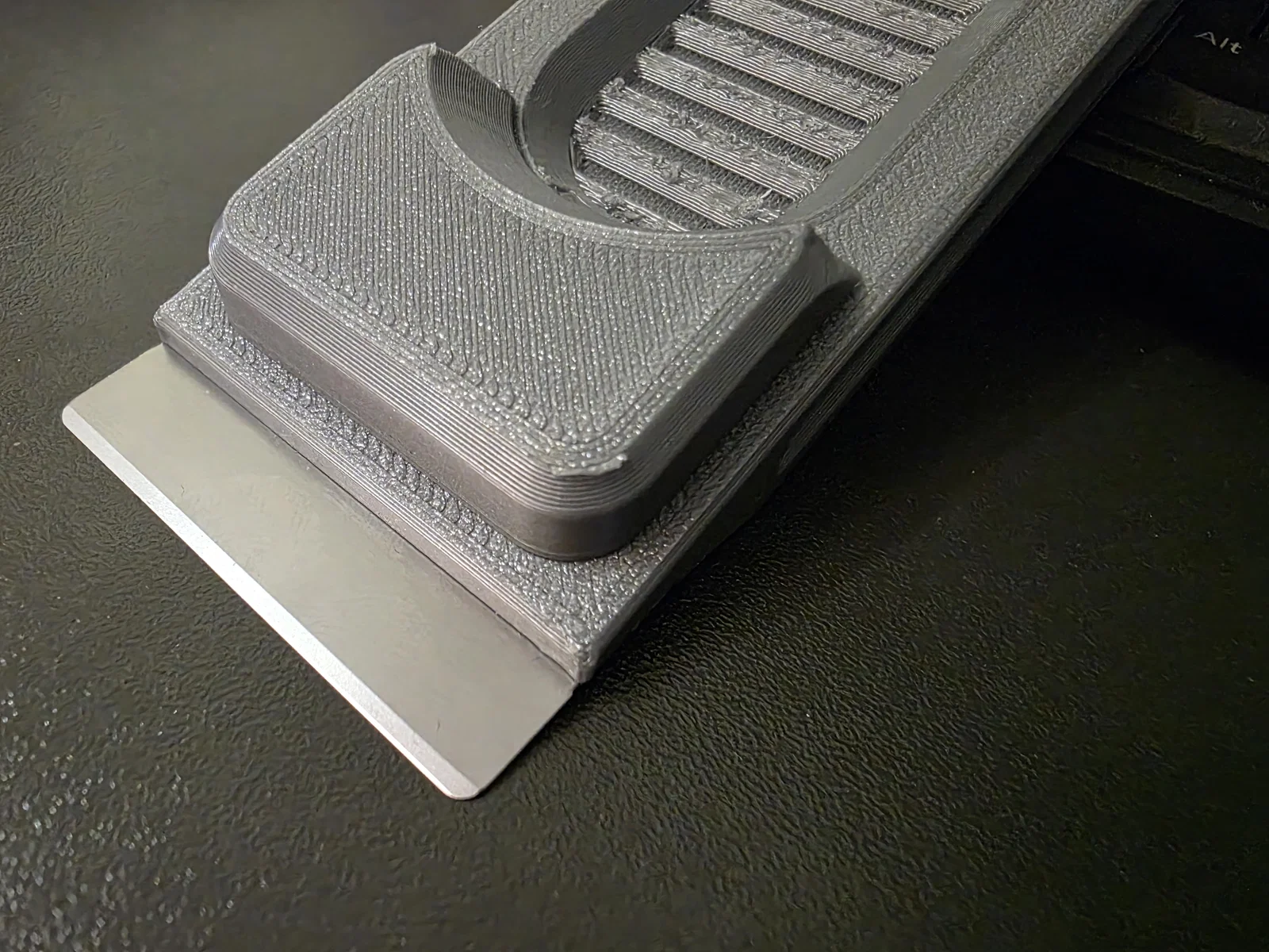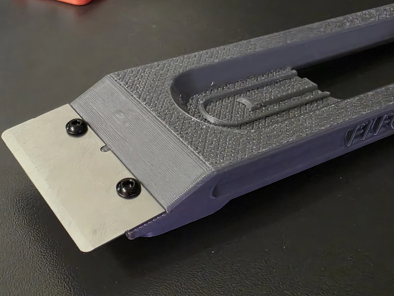 Bạn chỉ cần đặt lưỡi dao kim loại khớp với các lỗ bắt vít ở mặt trước của thân dụng cụ đã in. Lắp và vặn chặt hai con vít tự ren cho đến khi lưỡi dao phẳng và được cố định chắc chắn vào vị trí.