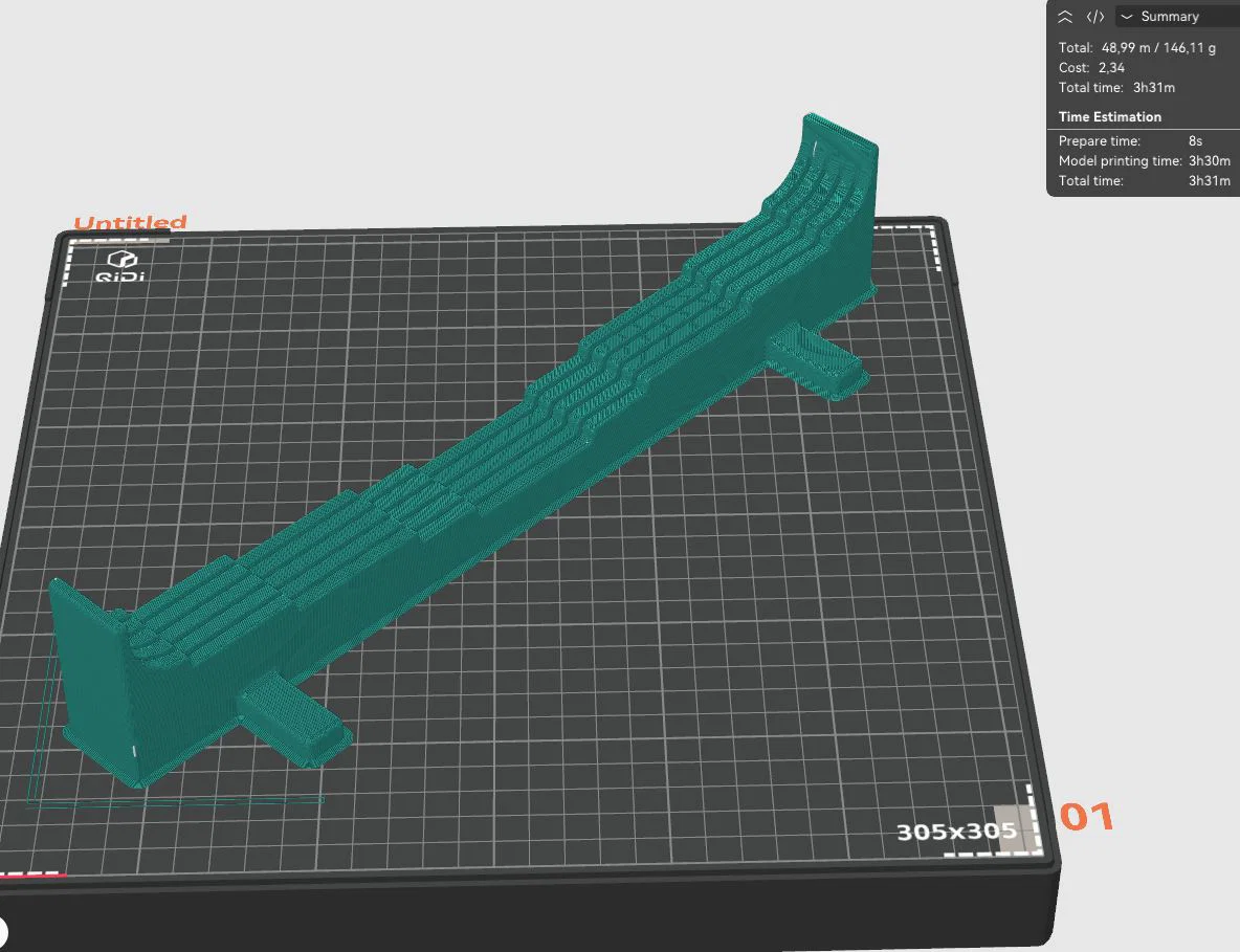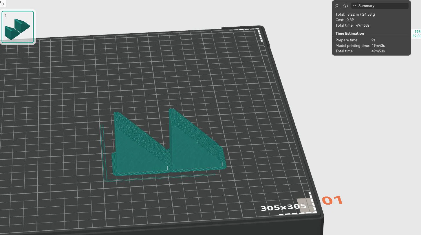 Phần giá đỡ (Holder) - in bằng nhựa PLA, infill 20% dạng tổ ong, 2 lớp tường (walls) là dùng tốt. Hãy xoay góc 45 độ khi đặt trên bàn in. Mỗi cái nặng khoảng 145g, in mất khoảng 3 tiếng 30 phút. Phần góc trên (Top corners) - in bằng nhựa PLA, infill 8% dạng tổ ong, 2 lớp tường (walls) là dùng tốt. Mỗi cái nặng 12g, in mất 49 phút.